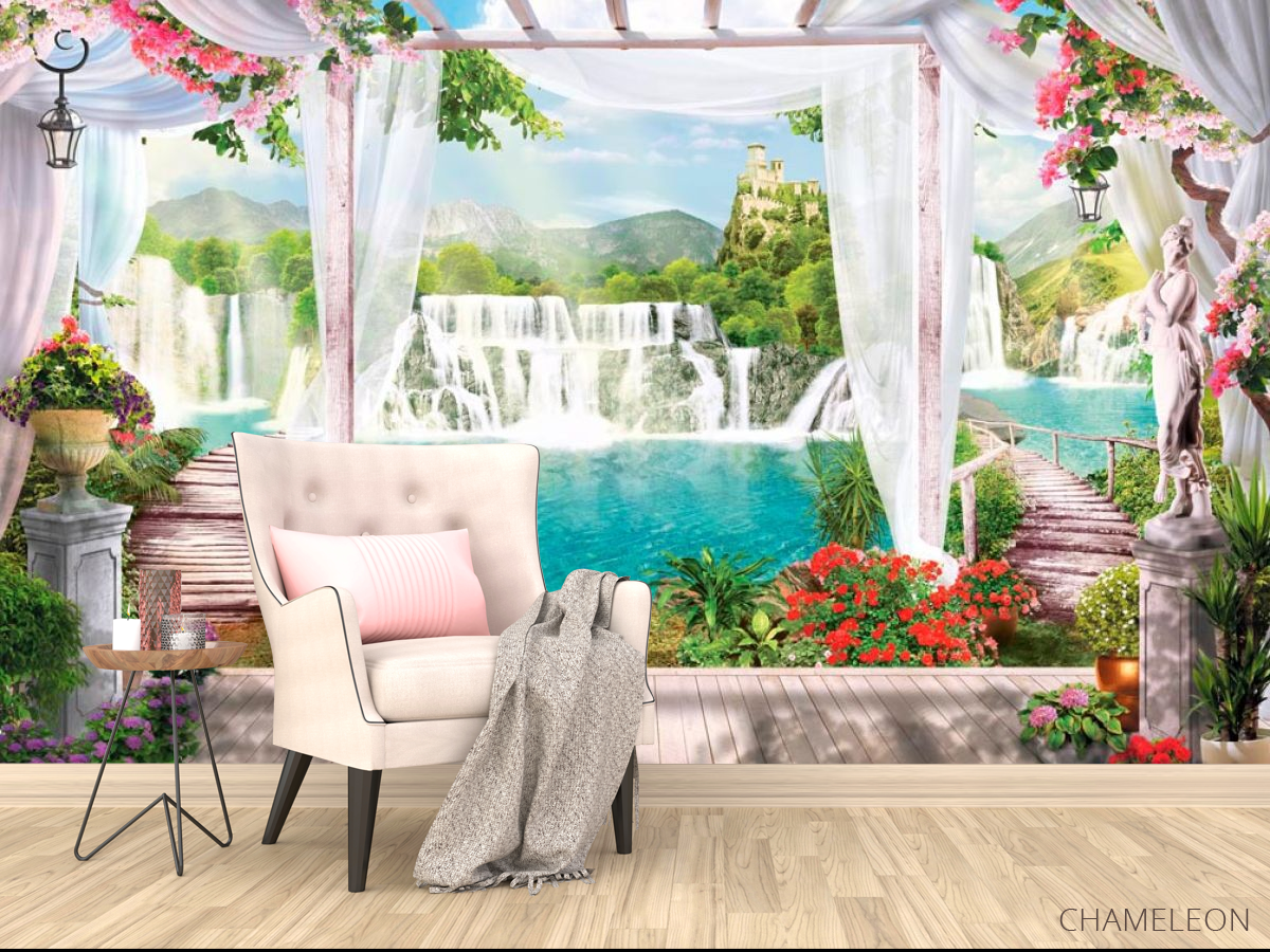Фотообои Водопад, замок, цветы 15165