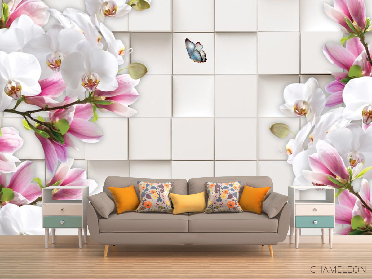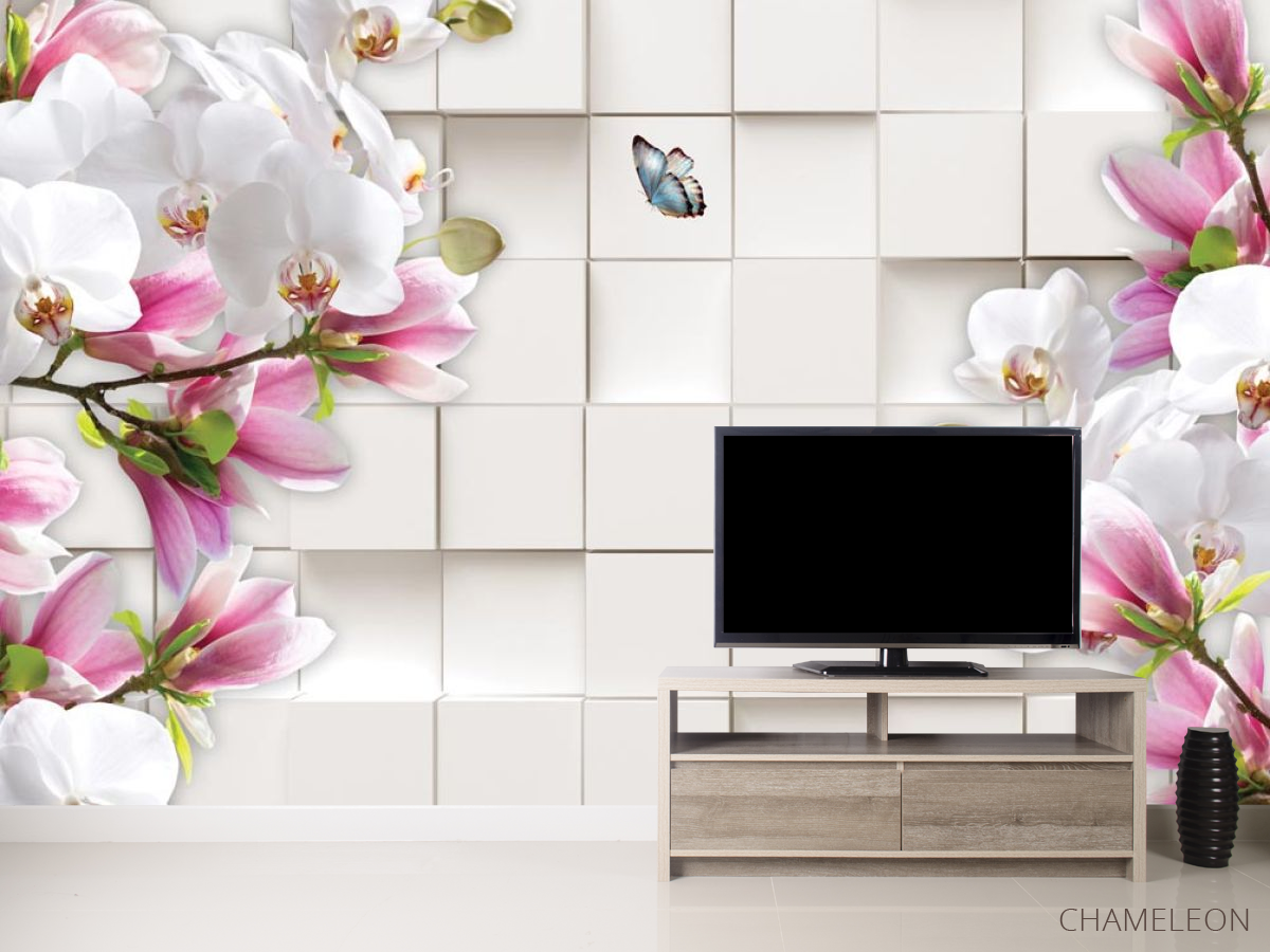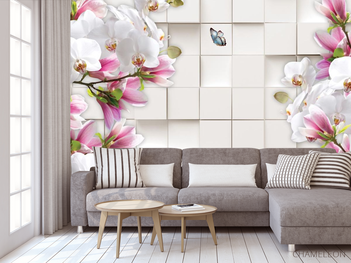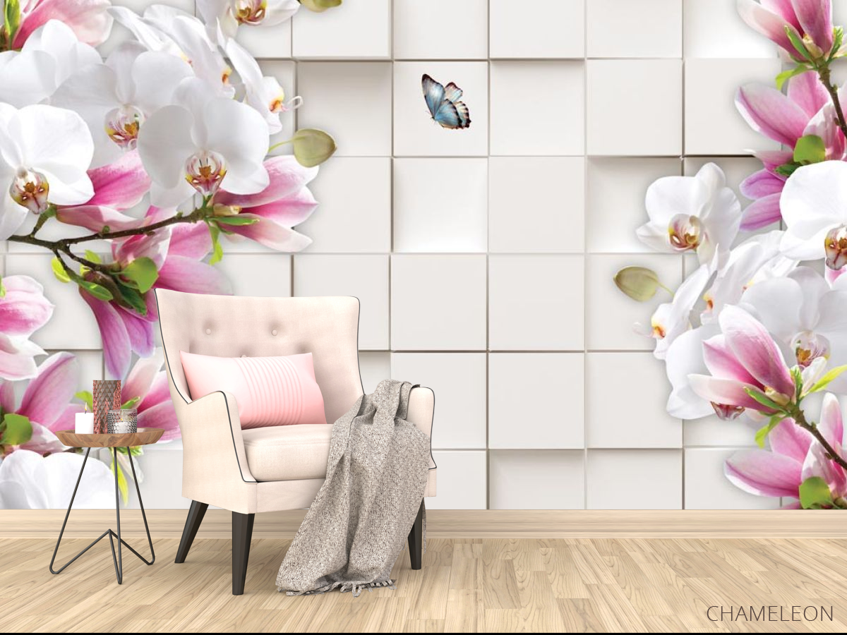 Фотообои Магнолии на фоне 3д квадратов 17483
