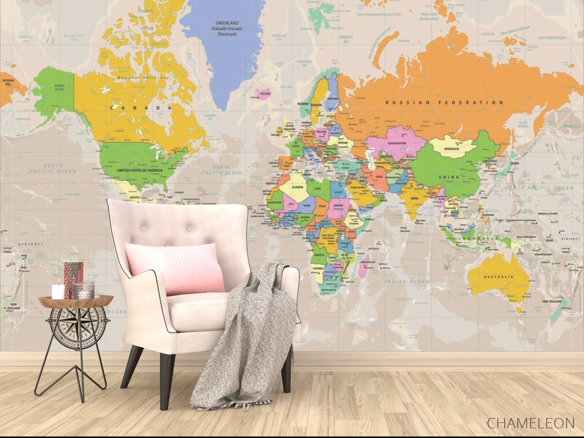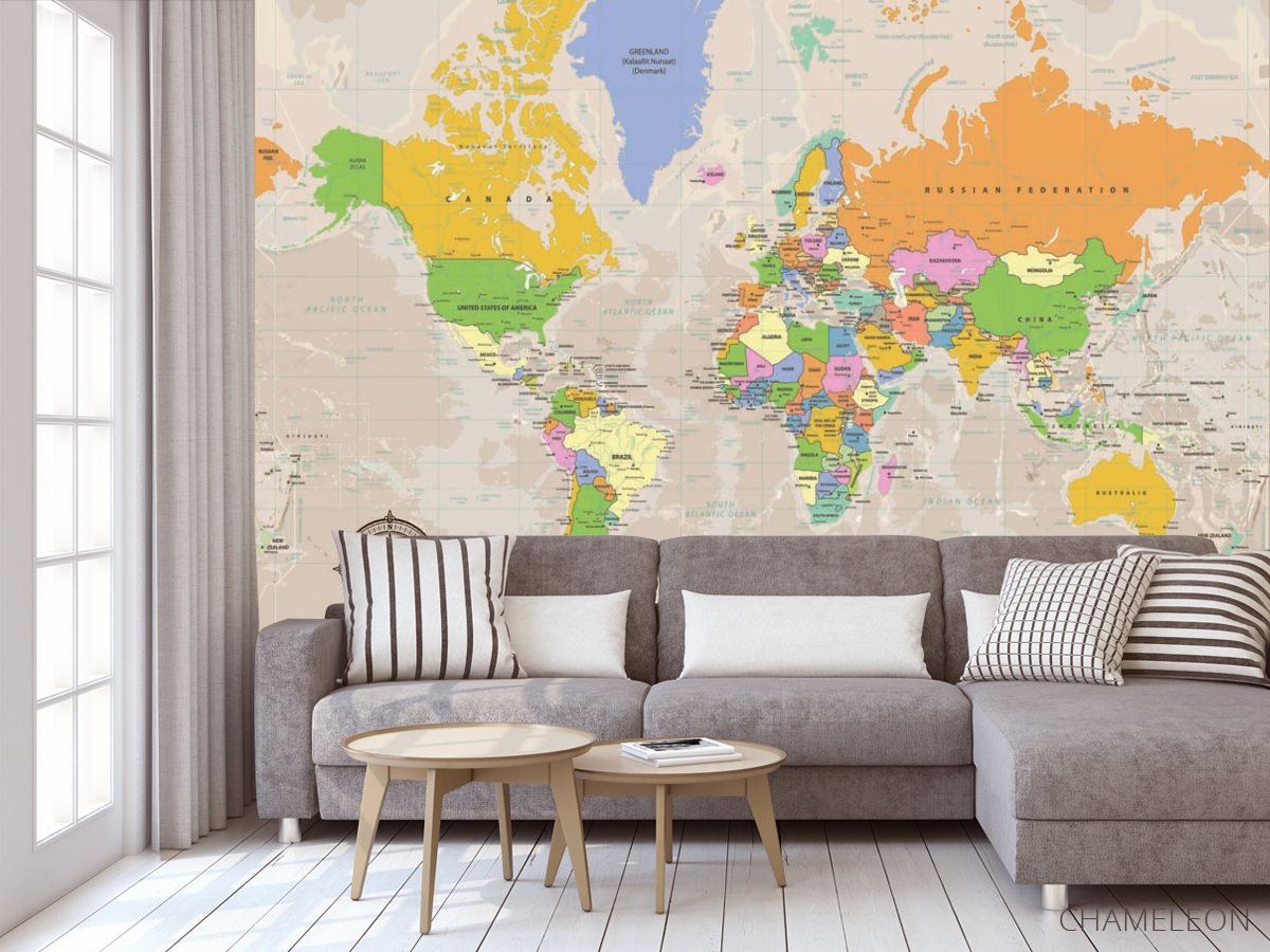 Фотообои карта мира являются очень хорошим выбором как для дома (в гостиную, рабочий кабинет или кухню), так и для других зданий (в школу, ресторан или салон красоты). Они выглядят роскошно, имеют стильный дизайн и отлично подходят под любое оформление комнаты. Современные фотообои на стену производятся из надежного материала, который не портится и не царапается. Изображение - это полностью безопасная краска, которая не вызывает аллергии, а также остается красивым в течение многих лет. Вы можете уверенно использовать обои, которые украсят любое помещение. Купить стильные и оригинальные фотообои с картой мира можно в интернет-магазине Chameleons.