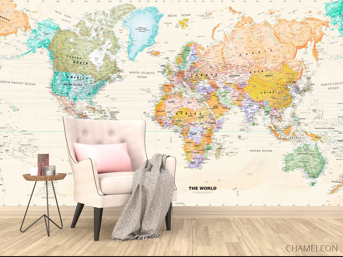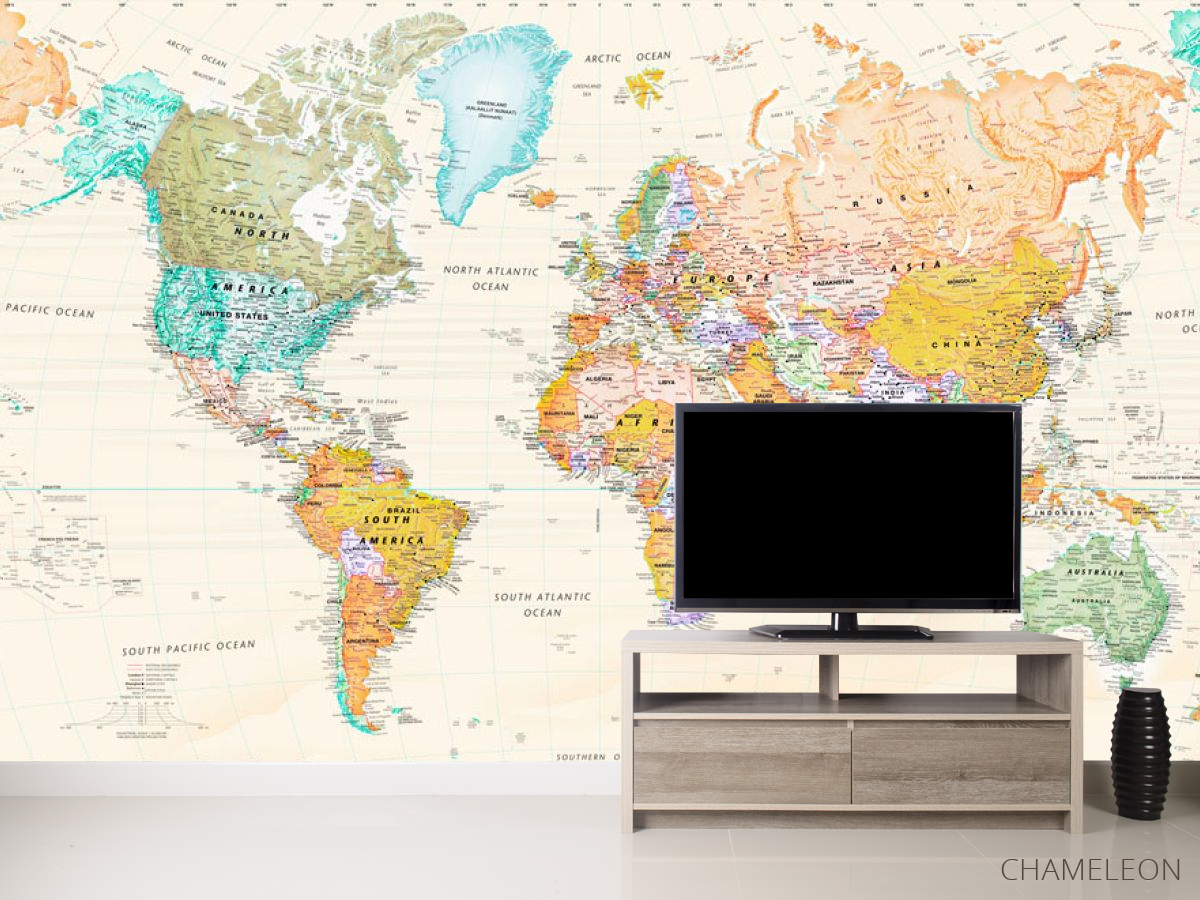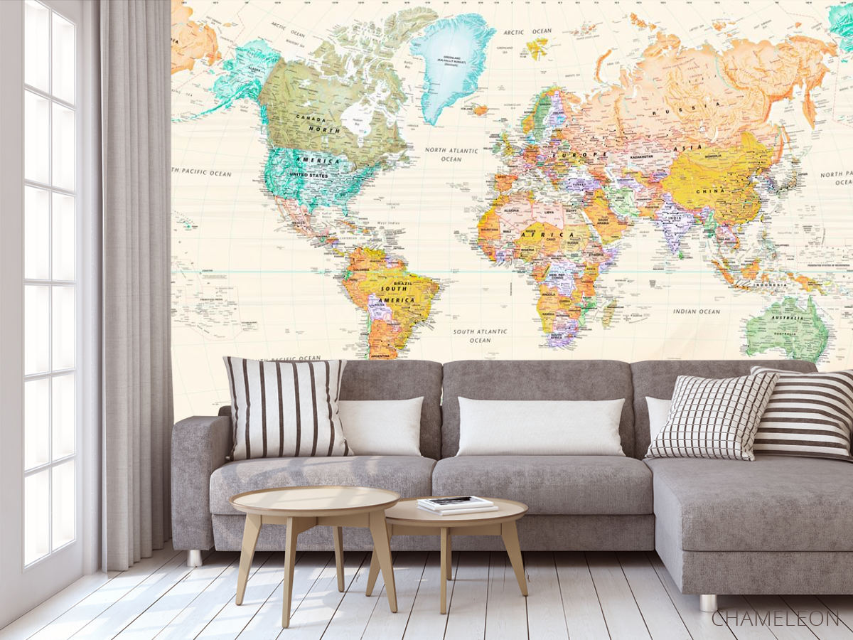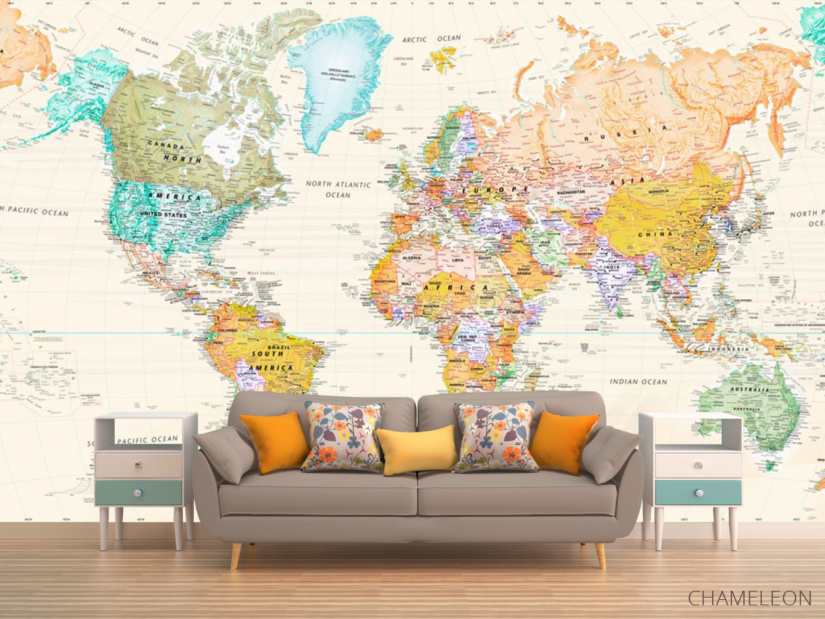 Фотообои карта мира являются очень хорошим выбором как для дома (в гостиную, рабочий кабинет или кухню), так и для других зданий (в школу, ресторан или салон красоты). Они выглядят роскошно, имеют стильный дизайн и отлично подходят под любое оформление комнаты. Современные фотообои на стену производятся из надежного материала, который не портится и не царапается. Изображение - это полностью безопасная краска, которая не вызывает аллергии, а также остается красивым в течение многих лет. Вы можете уверенно использовать обои, которые украсят любое помещение. Купить стильные и оригинальные фотообои с картой мира можно в интернет-магазине Chameleons.