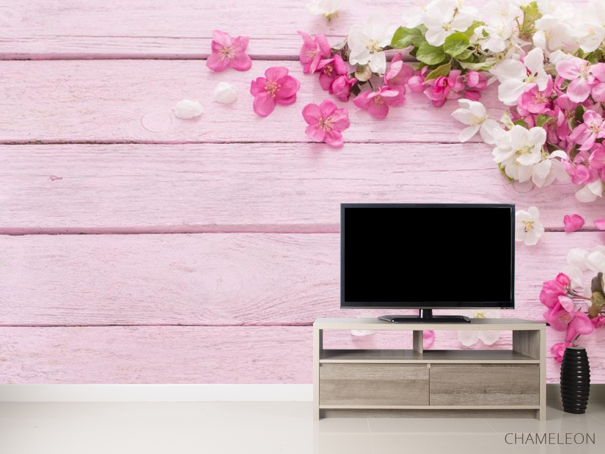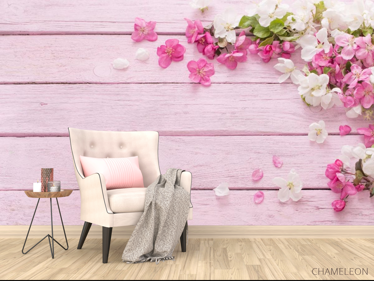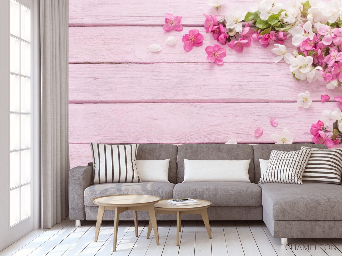 Фотообои белые и розовые лепестки на розовом деревянном фоне