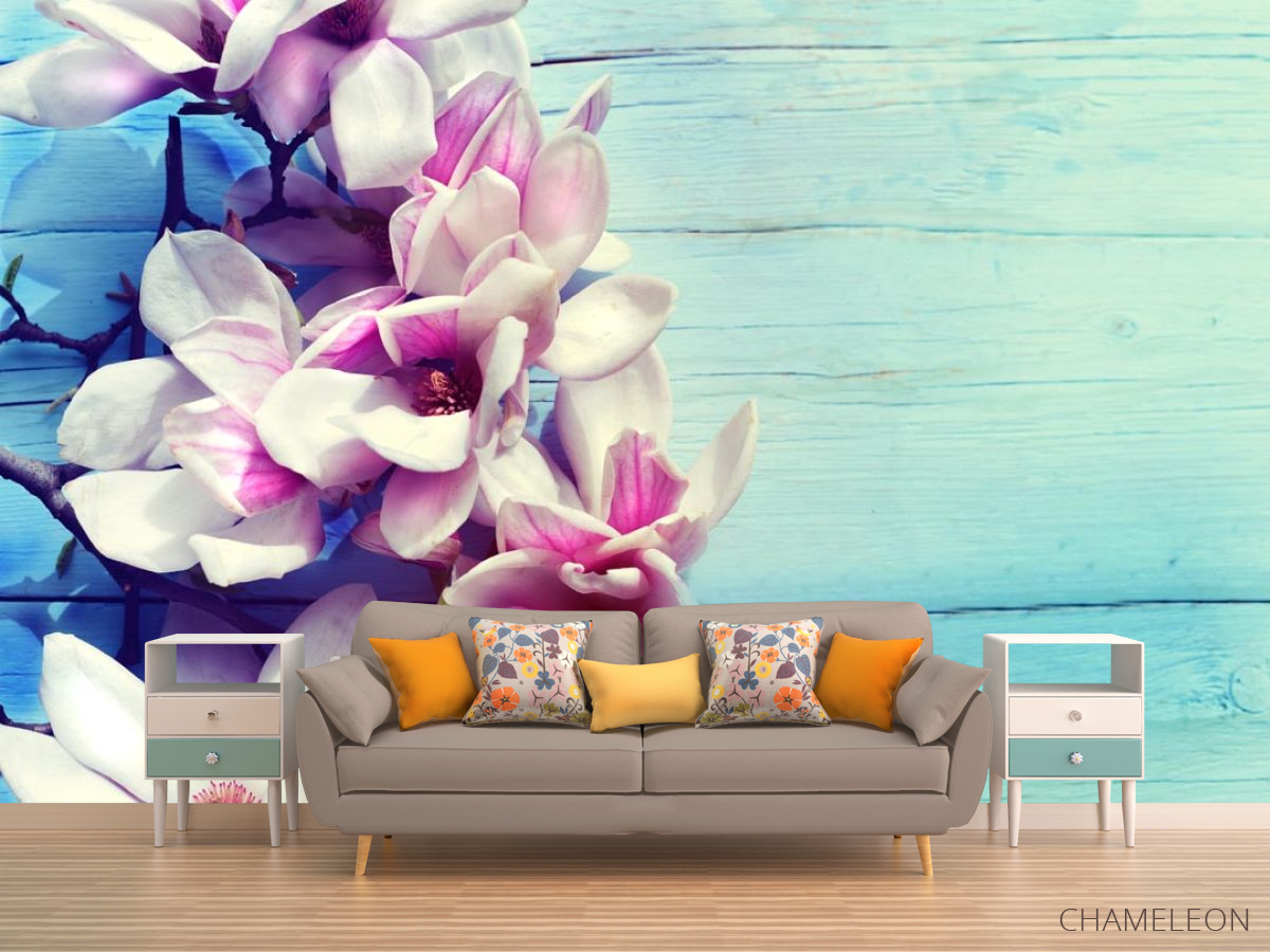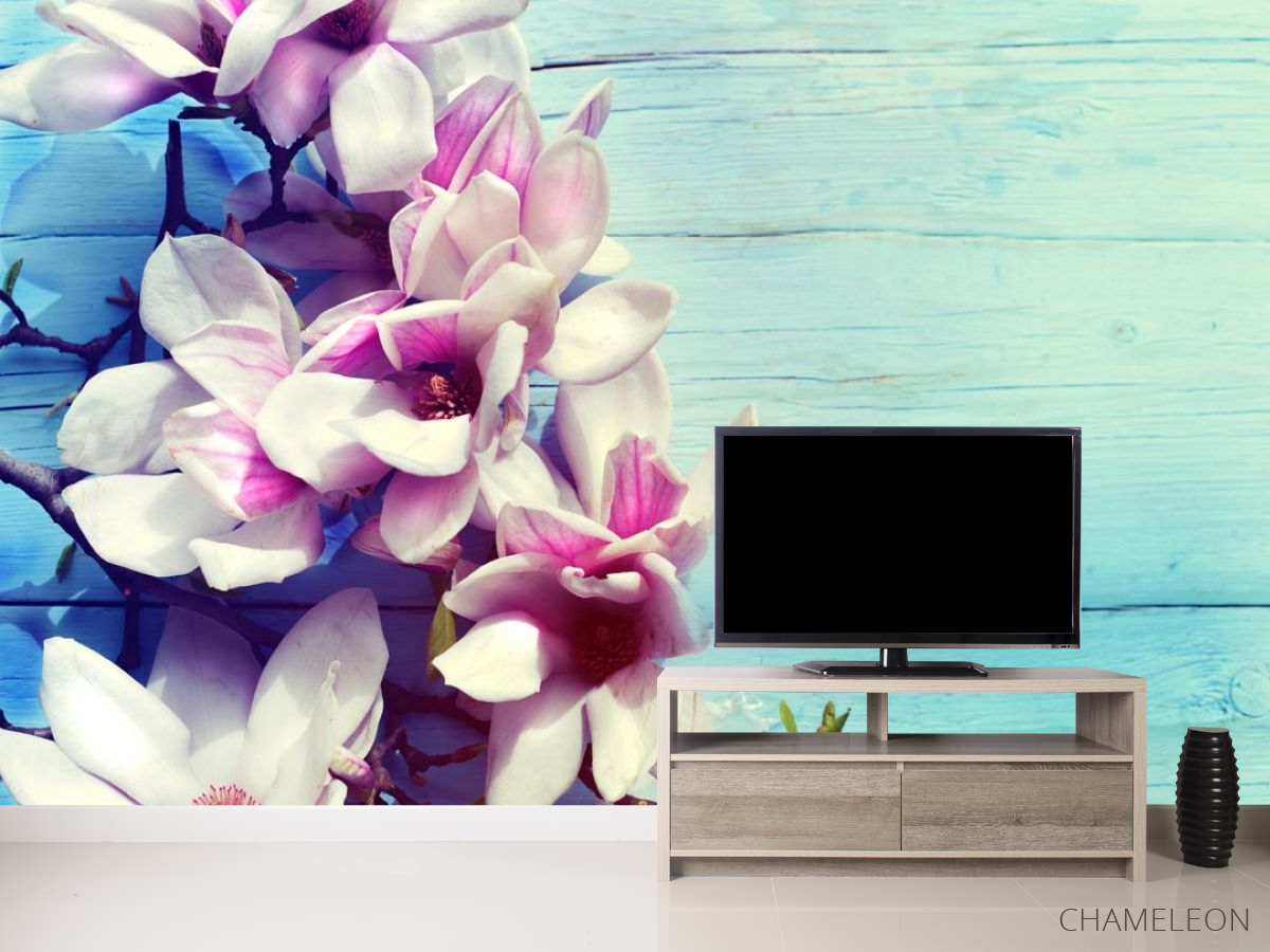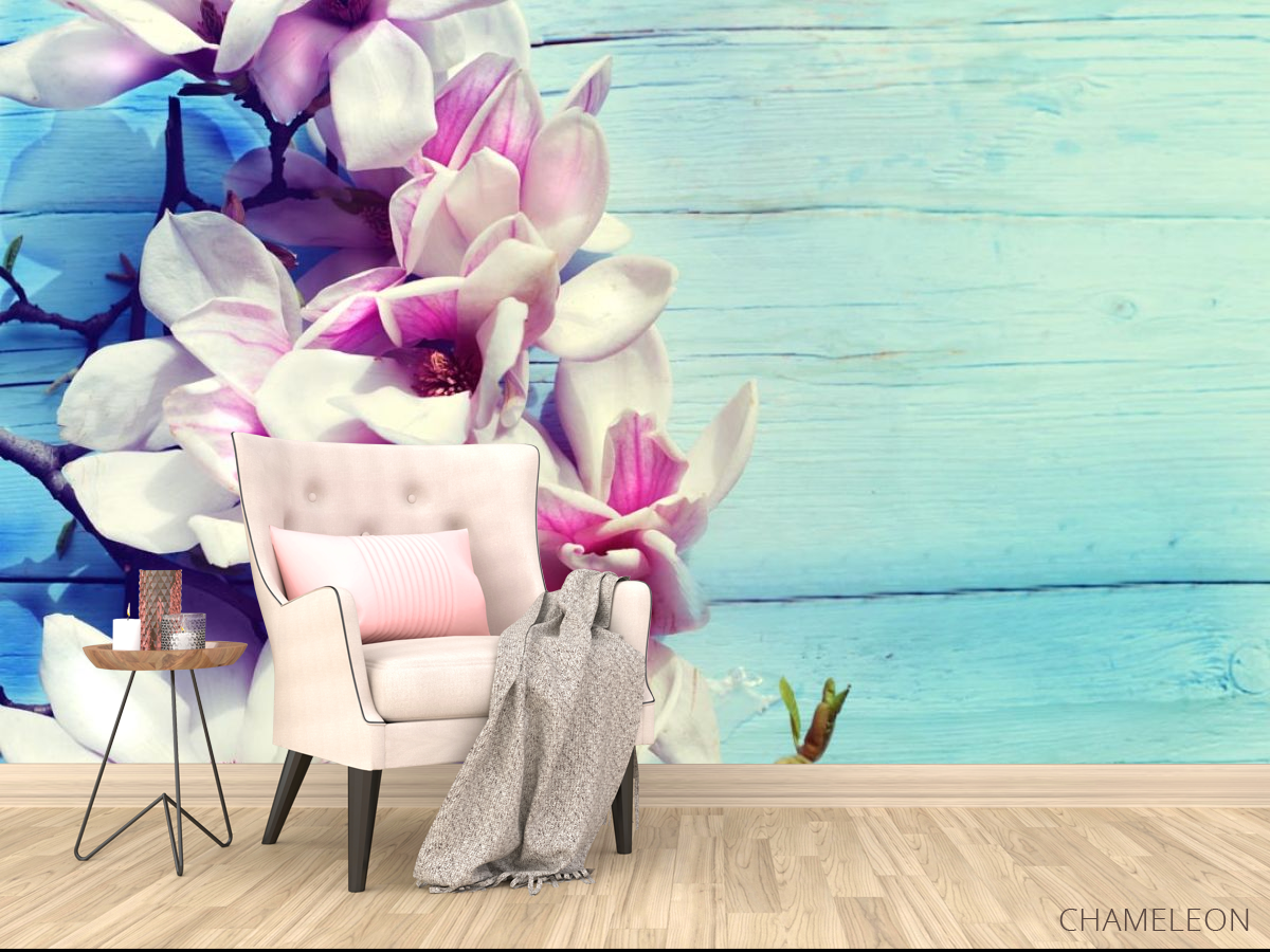 Фотообои цветы на голубом деревянном фоне