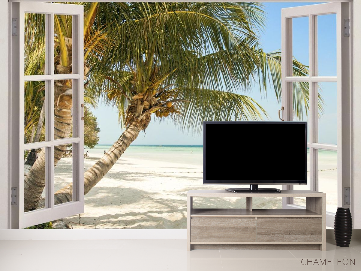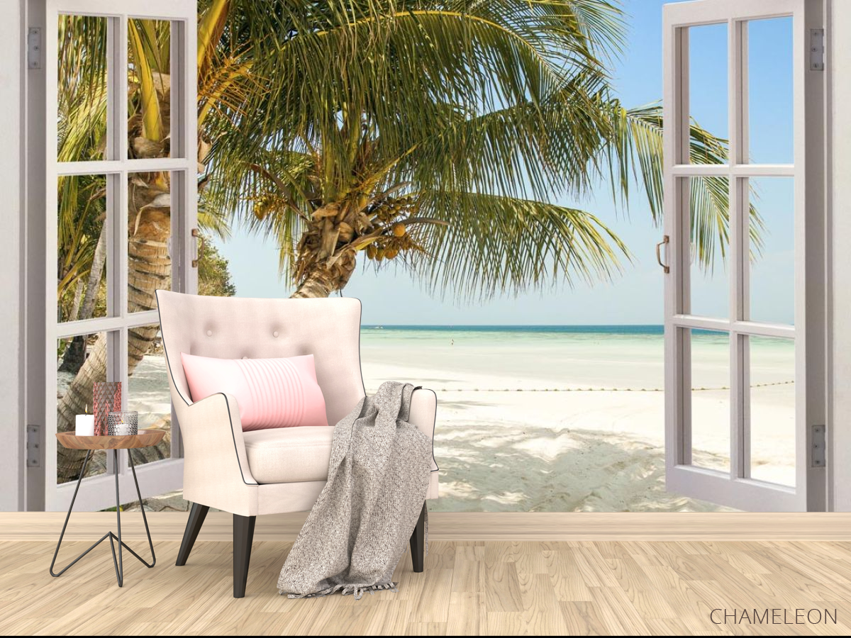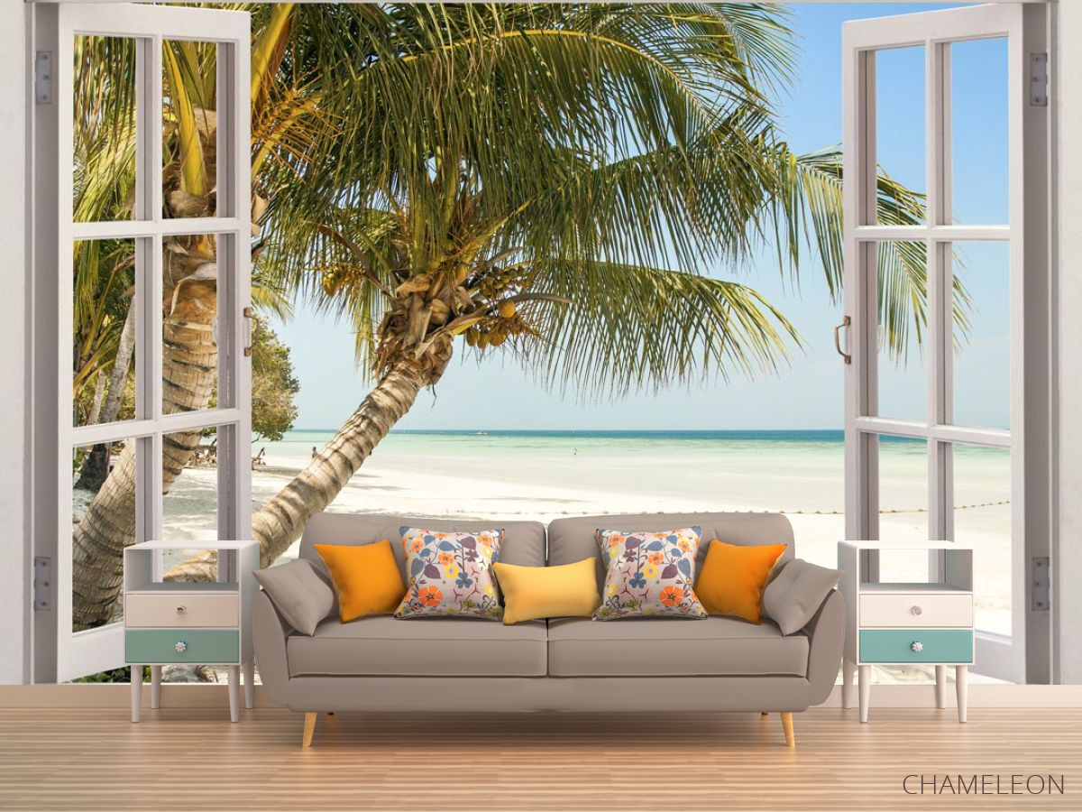 Фотообои Пальма и море в окне