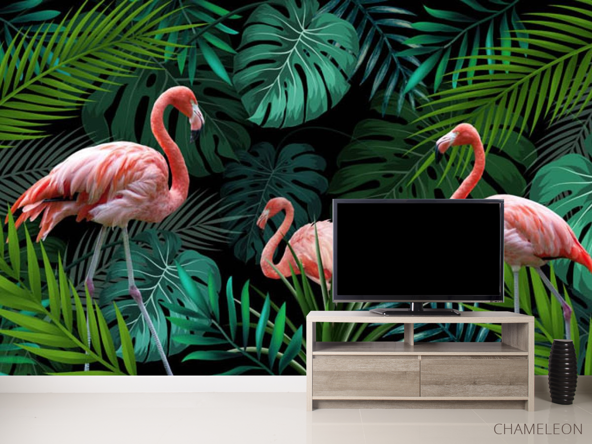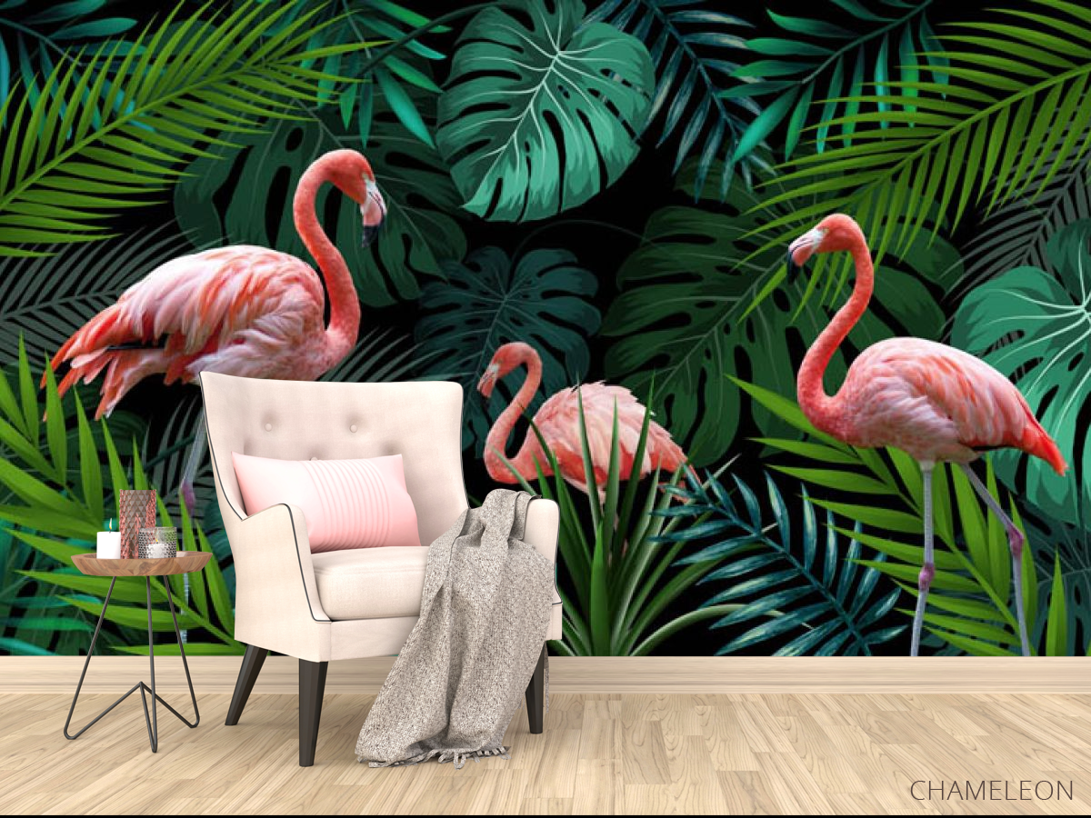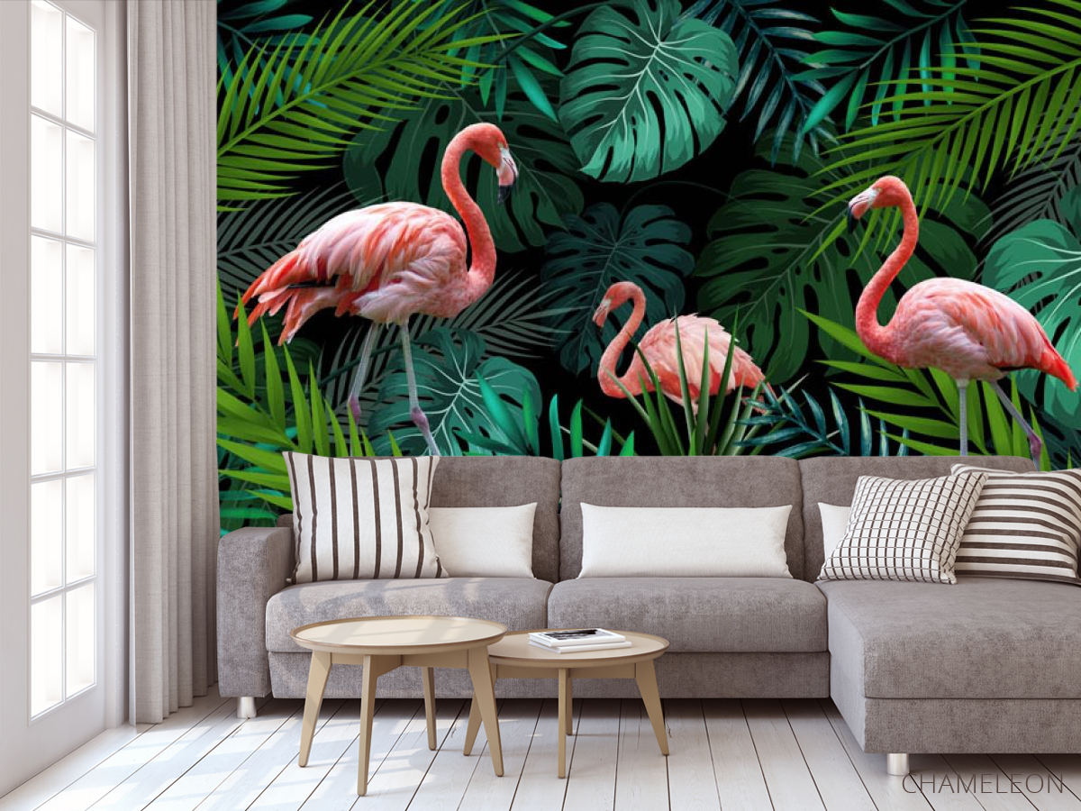 «Фотообои фламинго на тропических листьях», (арт. 28756) - купить в интернет-магазине Chameleon