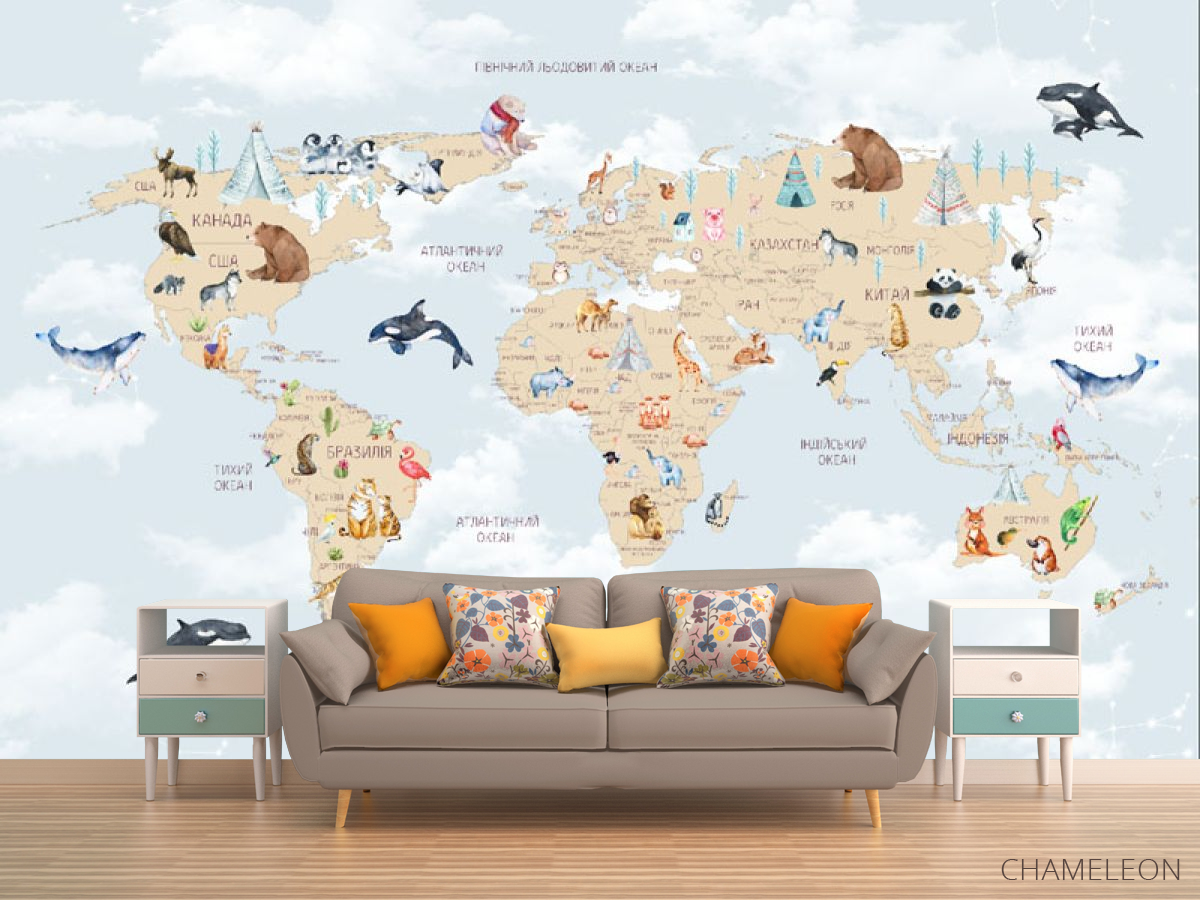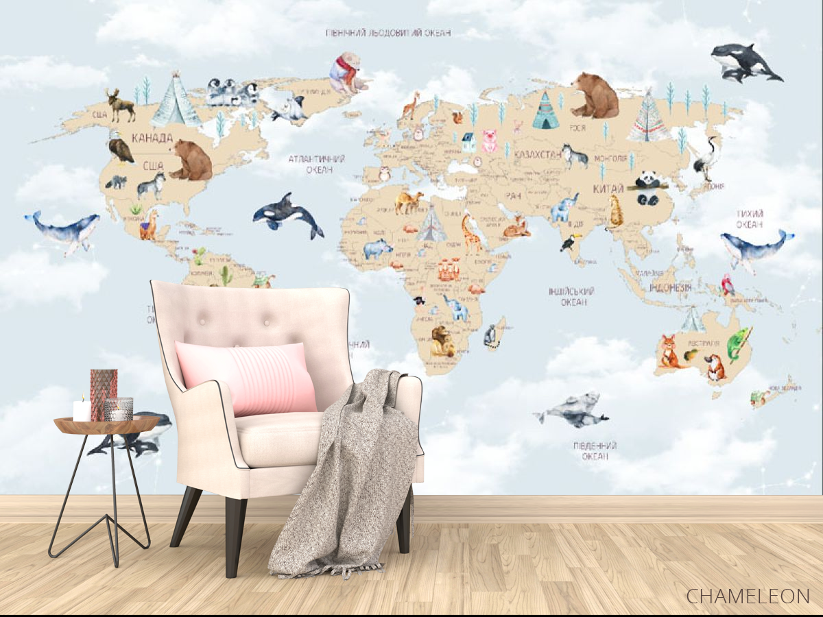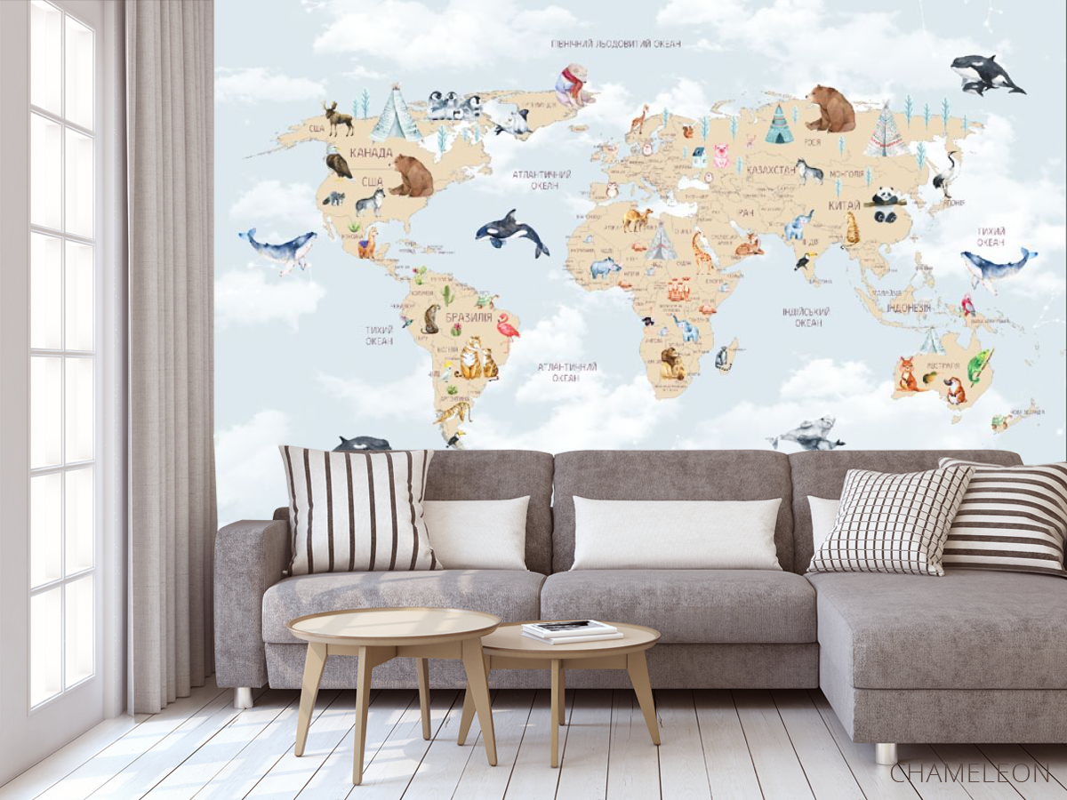 Фотообои Карта детская с облачками на украинском языке в синем цвете. 30289_1