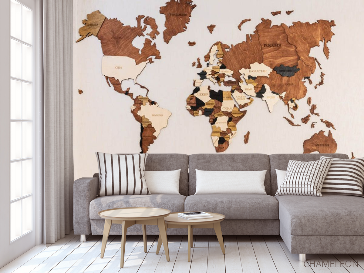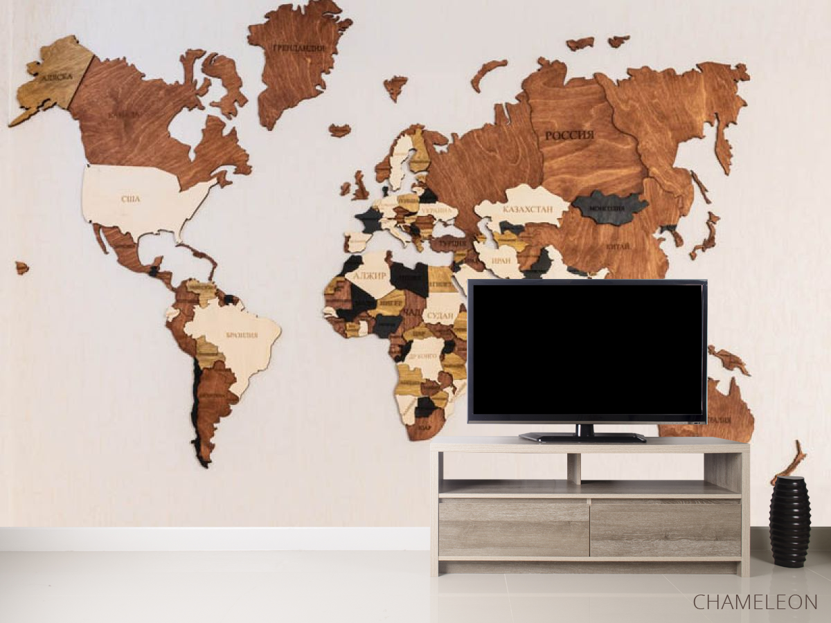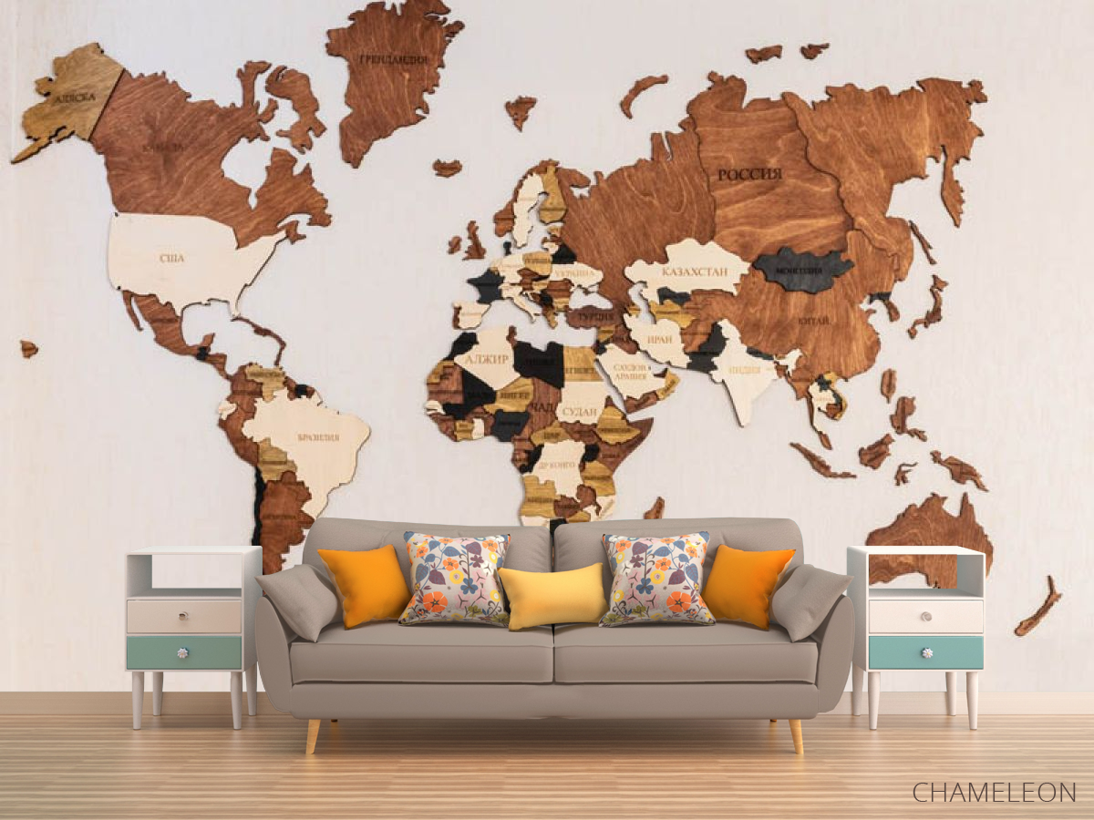 Фотообои карта мира являются очень хорошим выбором как для дома (в гостиную, рабочий кабинет или кухню), так и для других зданий (в школу, ресторан или салон красоты). Они выглядят роскошно, имеют стильный дизайн и отлично подходят под любое оформление комнаты. Современные фотообои на стену производятся из надежного материала, который не портится и не царапается. Изображение - это полностью безопасная краска, которая не вызывает аллергии, а также остается красивым в течение многих лет. Вы можете уверенно использовать обои, которые украсят любое помещение. Купить стильные и оригинальные фотообои с картой мира можно в интернет-магазине Chameleons.