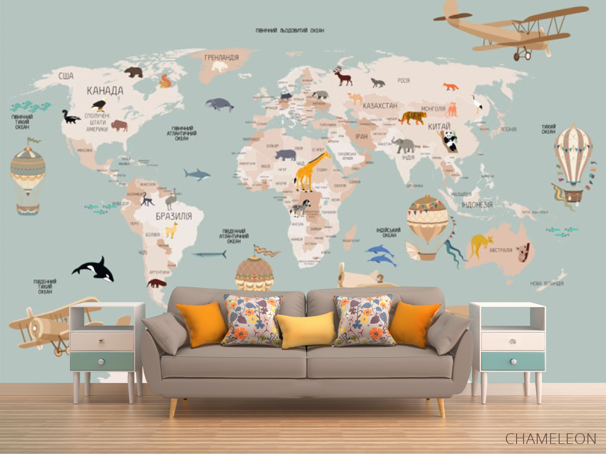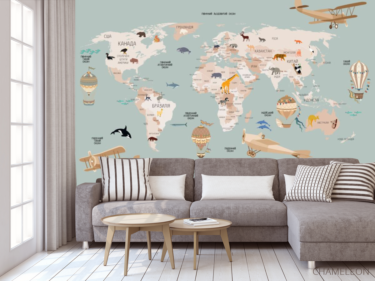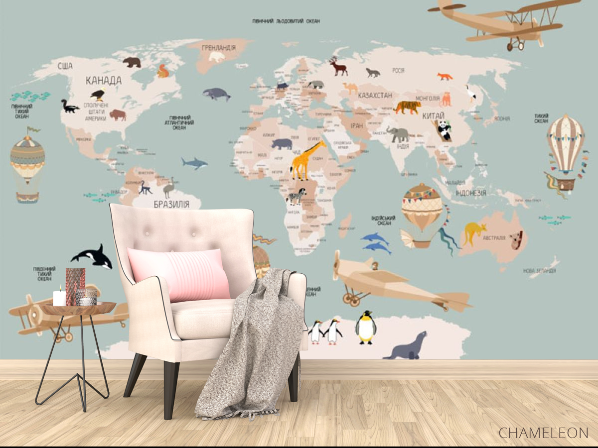Фотообои Бирюзовая карта с самолетами на украинском 30843