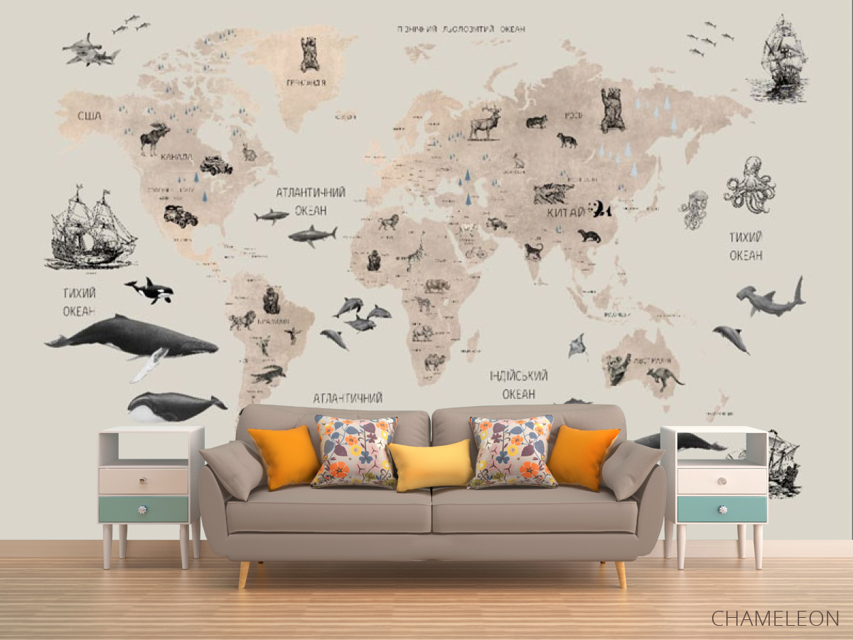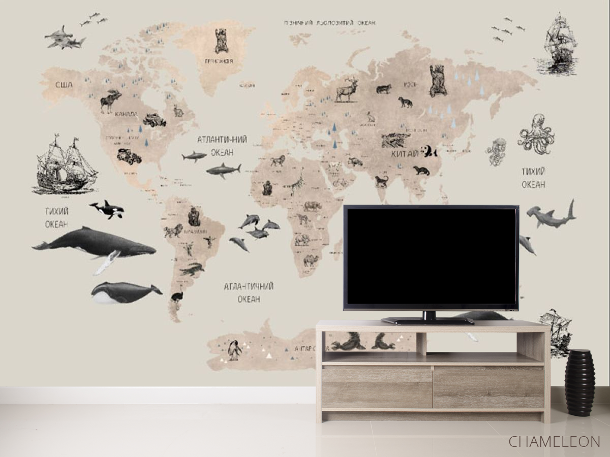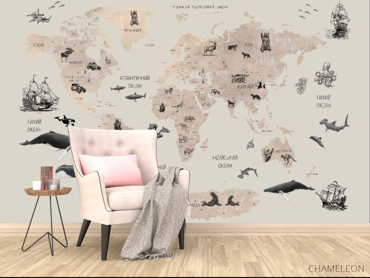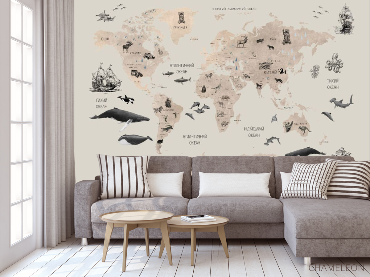 Фотообои Карта детская с морскими животными в бежевом цвете. 31770