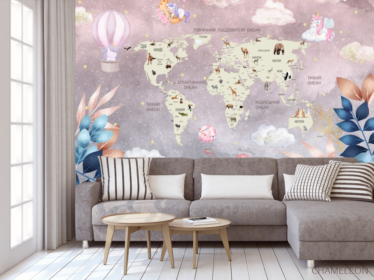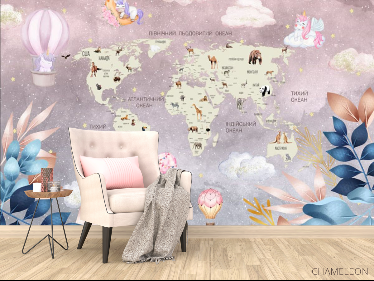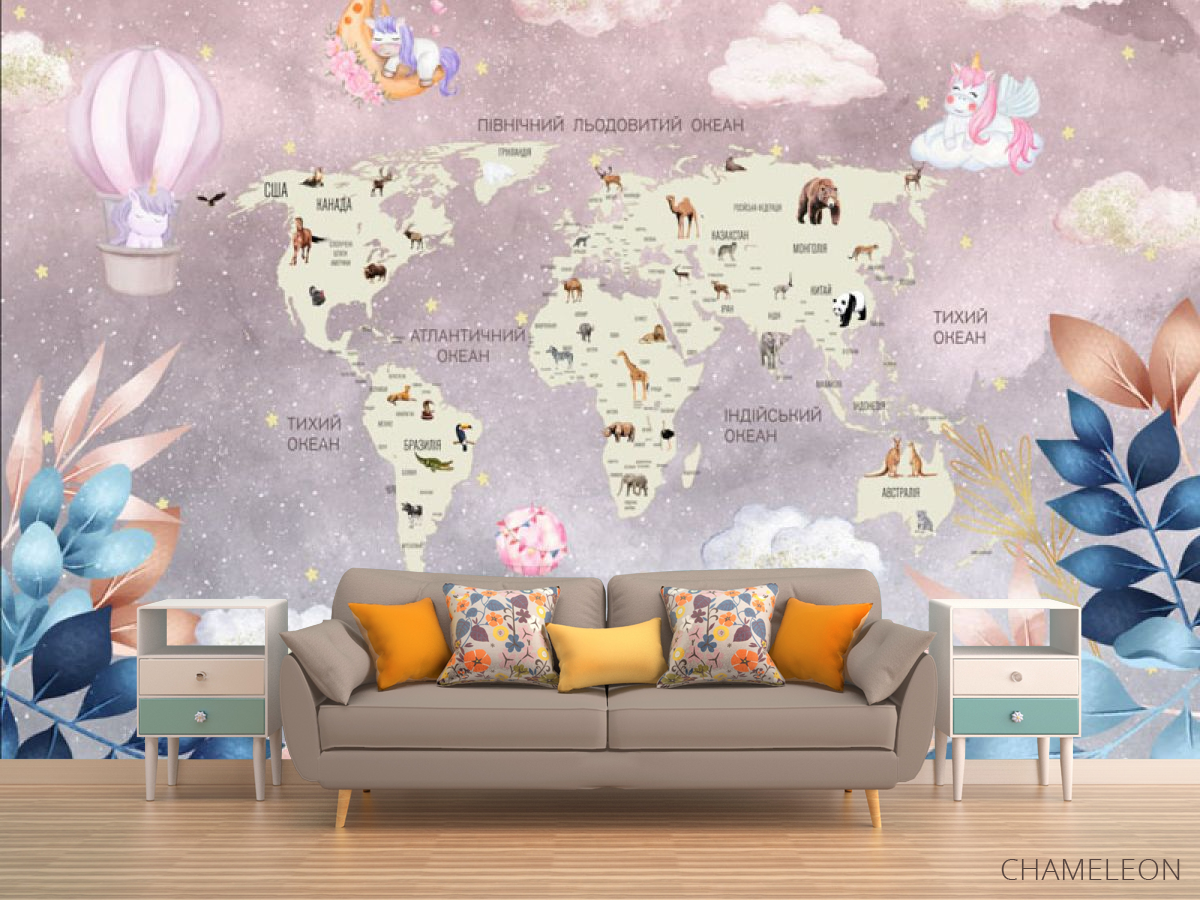 Фотообои Карта розовая в детскую для девочки с синими листьями. 31814