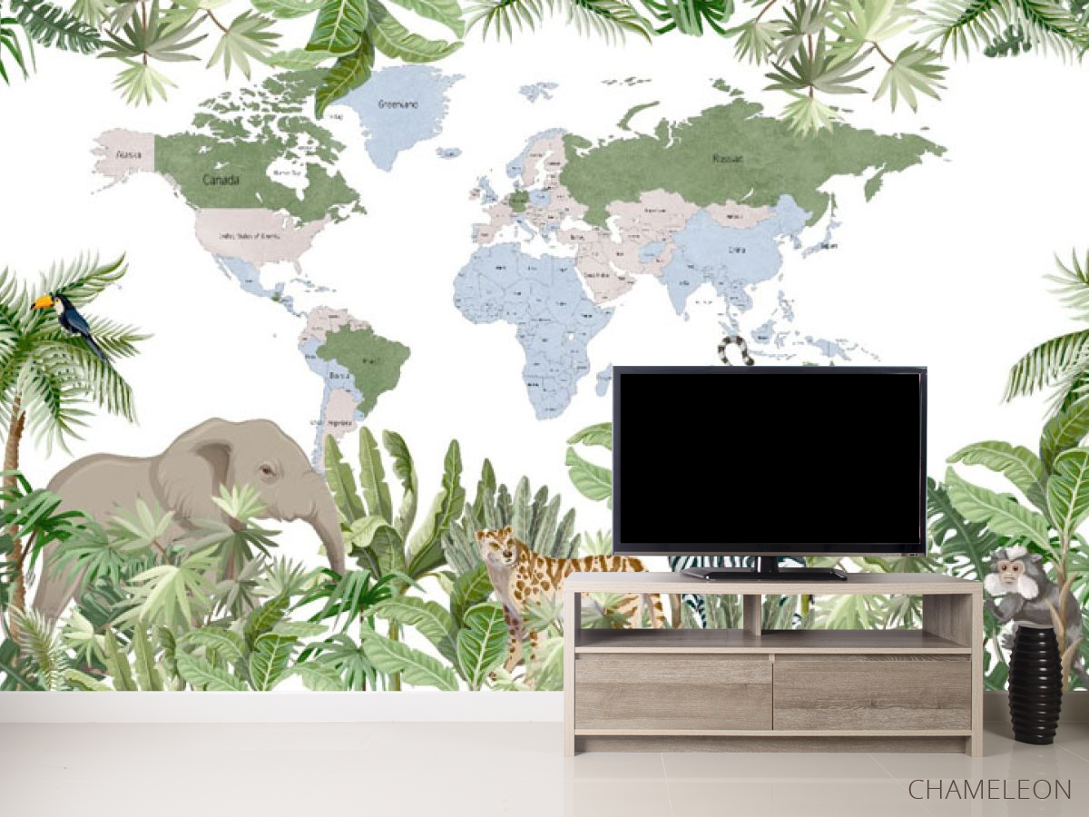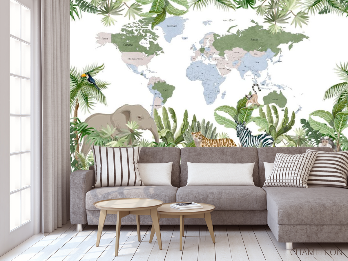 Фотообои Карта детская с тропическим лесом и животными на английском 31853_1