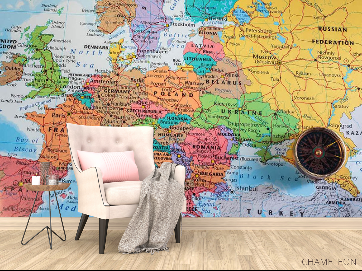 Фотообои карта мира являются очень хорошим выбором как для дома (в гостиную, рабочий кабинет или кухню), так и для других зданий (в школу, ресторан или салон красоты). Они выглядят роскошно, имеют стильный дизайн и отлично подходят под любое оформление комнаты. Современные фотообои на стену производятся из надежного материала, который не портится и не царапается. Изображение - это полностью безопасная краска, которая не вызывает аллергии, а также остается красивым в течение многих лет. Вы можете уверенно использовать обои, которые украсят любое помещение. Купить стильные и оригинальные фотообои с картой мира можно в интернет-магазине Chameleons.