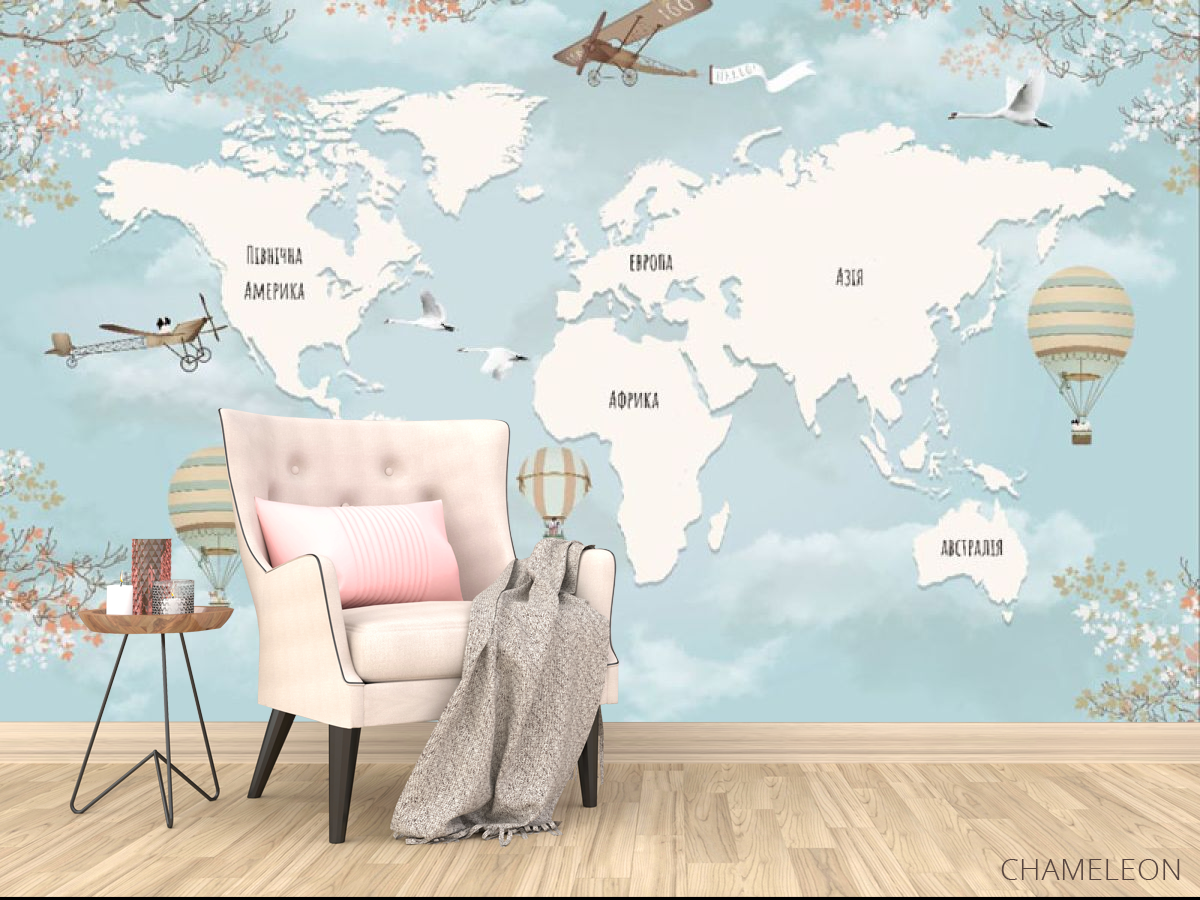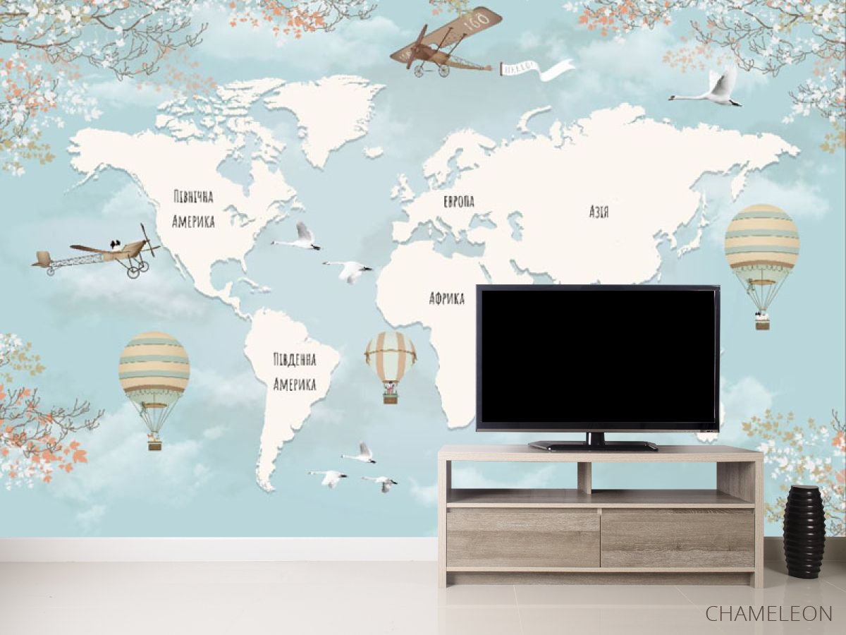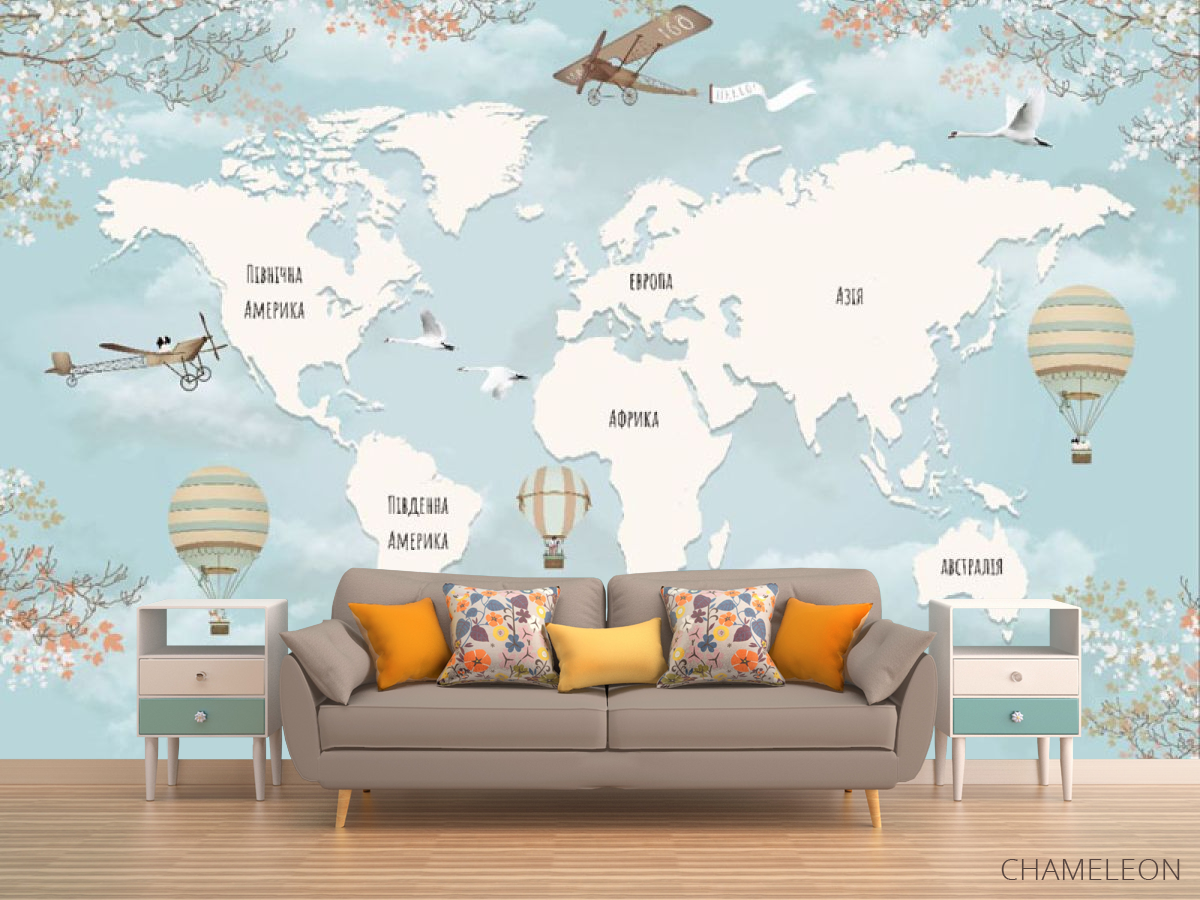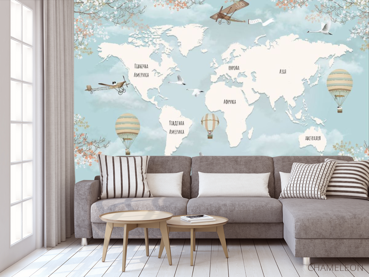 Фотообои Детская карта с континентами и ветвями в голубом цвете. 33230