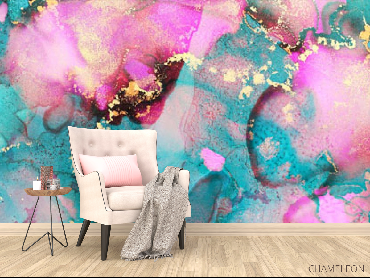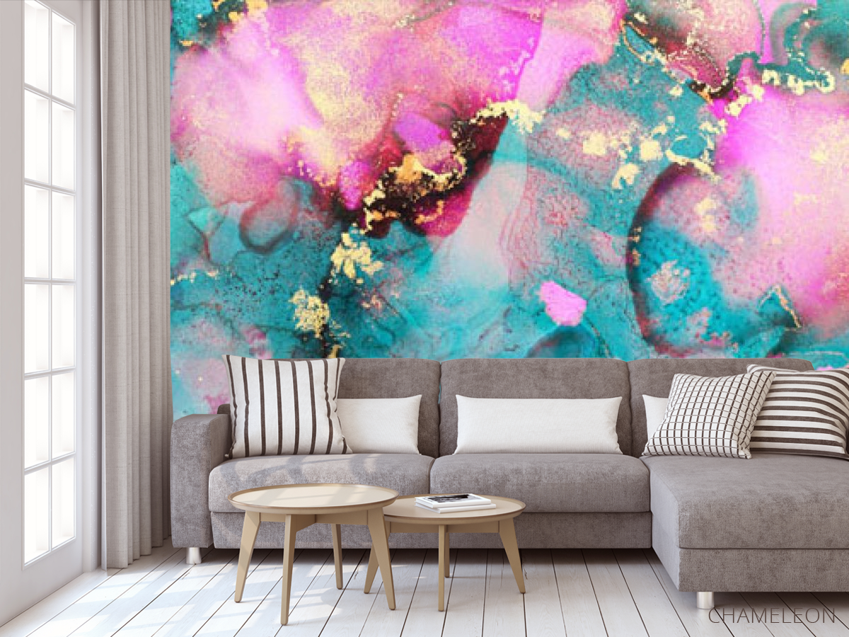 «Фотообои Бирюзово-розовый флюид с золотом», (арт. 33835) - купить в интернет-магазине Chameleon