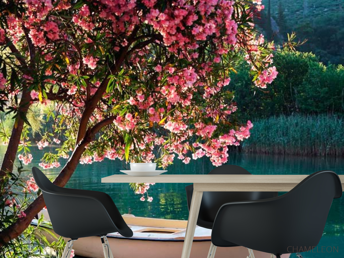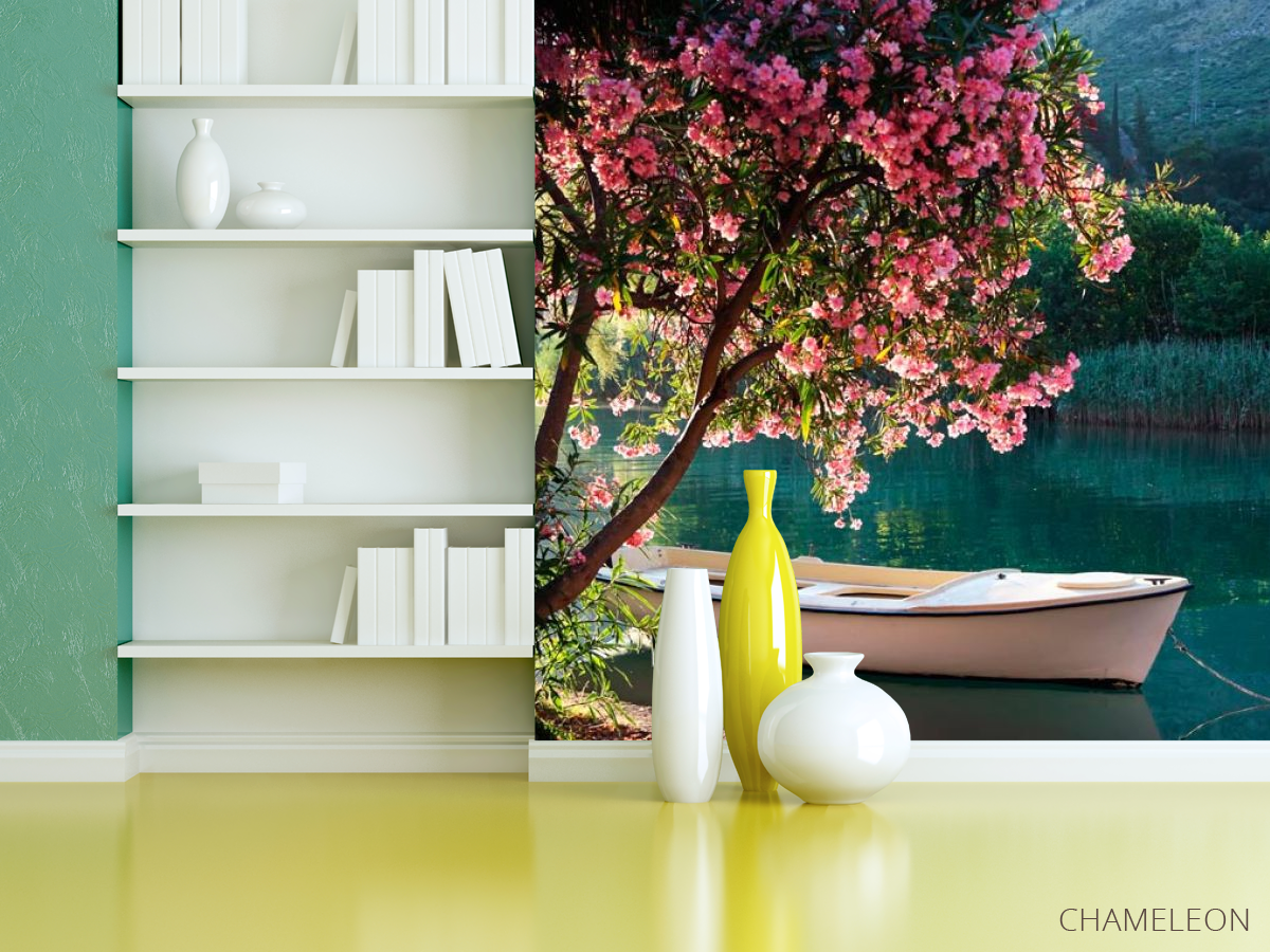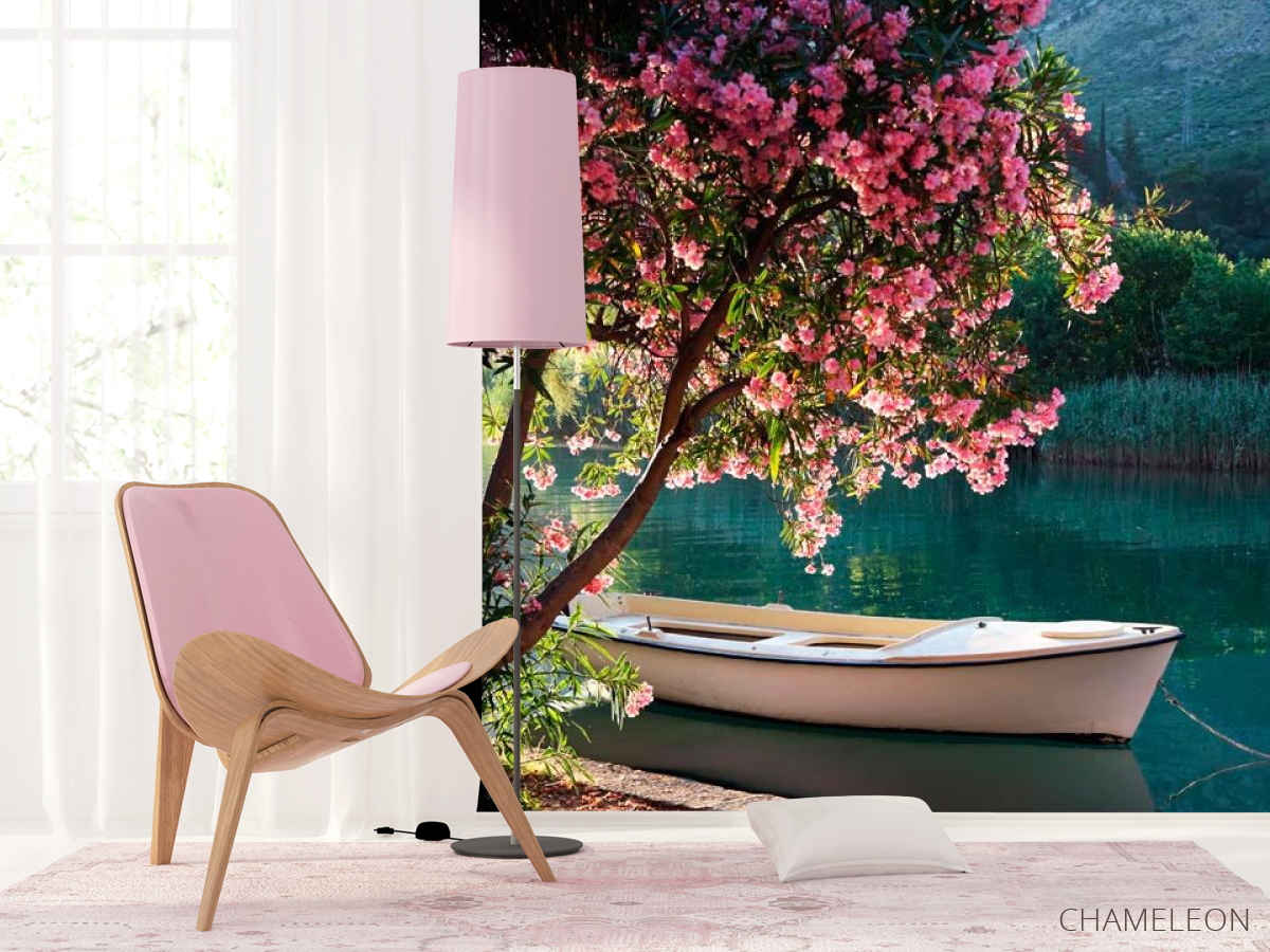 Фотошпалери Човен, берег, квіти