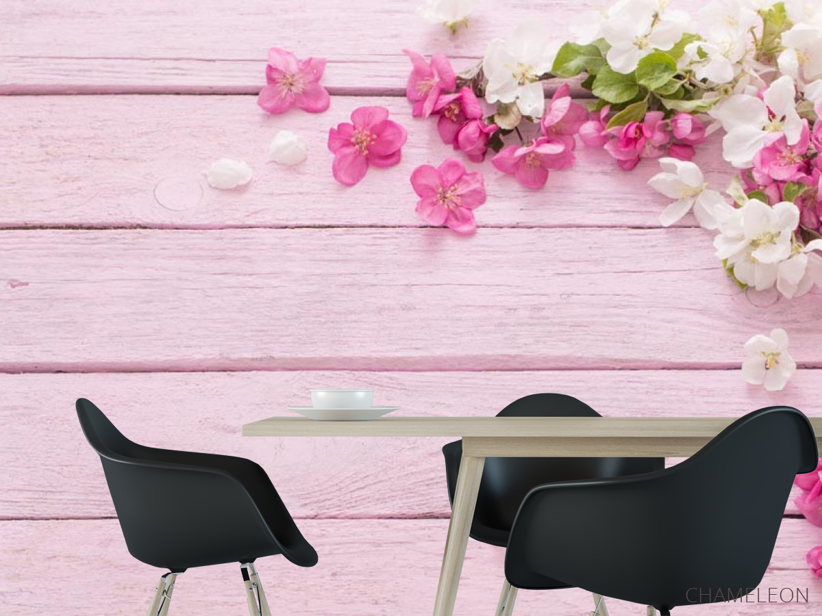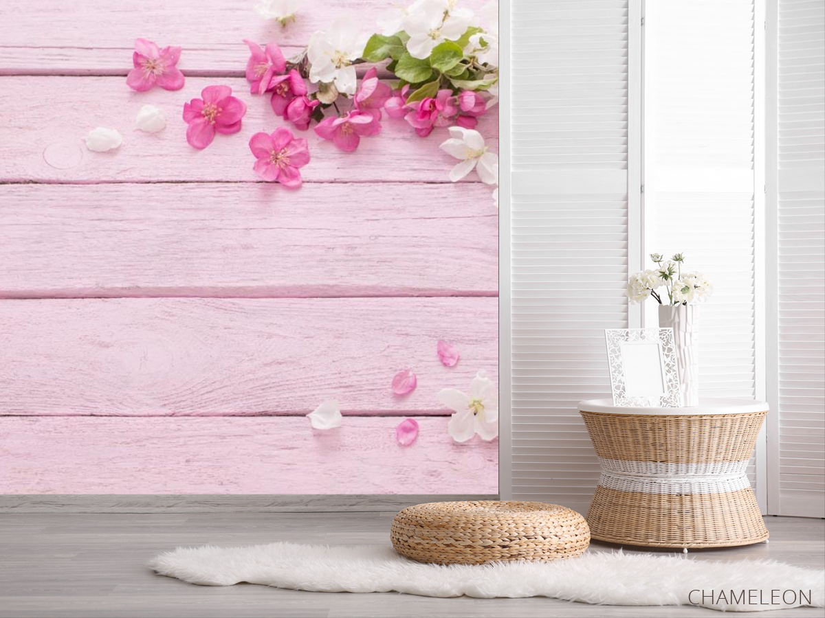 Фотошпалери білі і рожеві пелюстки на рожевому дерев'яному тлі