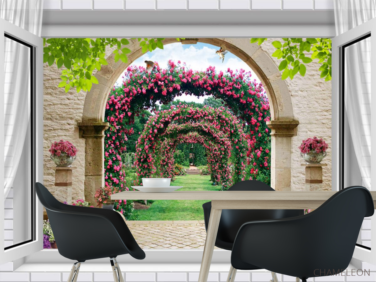 Фотошпалери Вид з вікна на сад з трояндами 22177