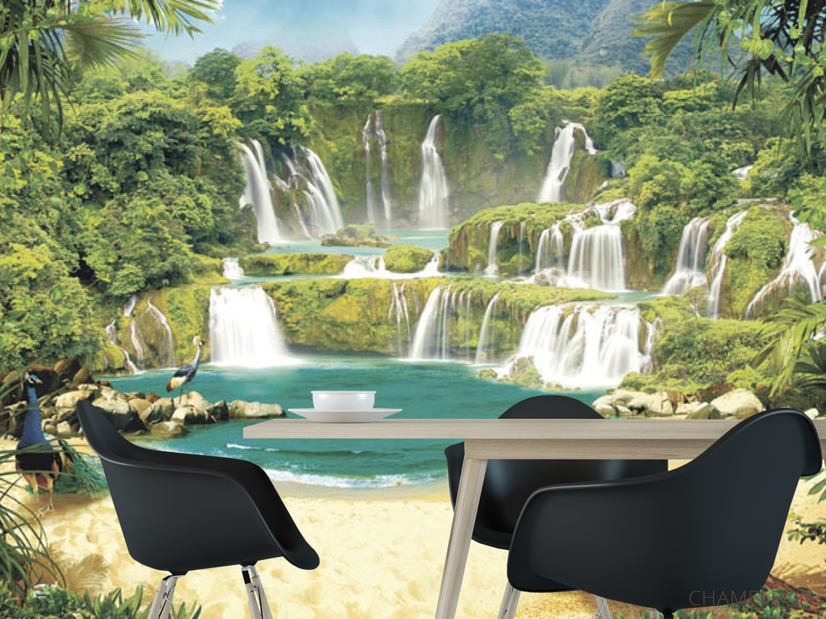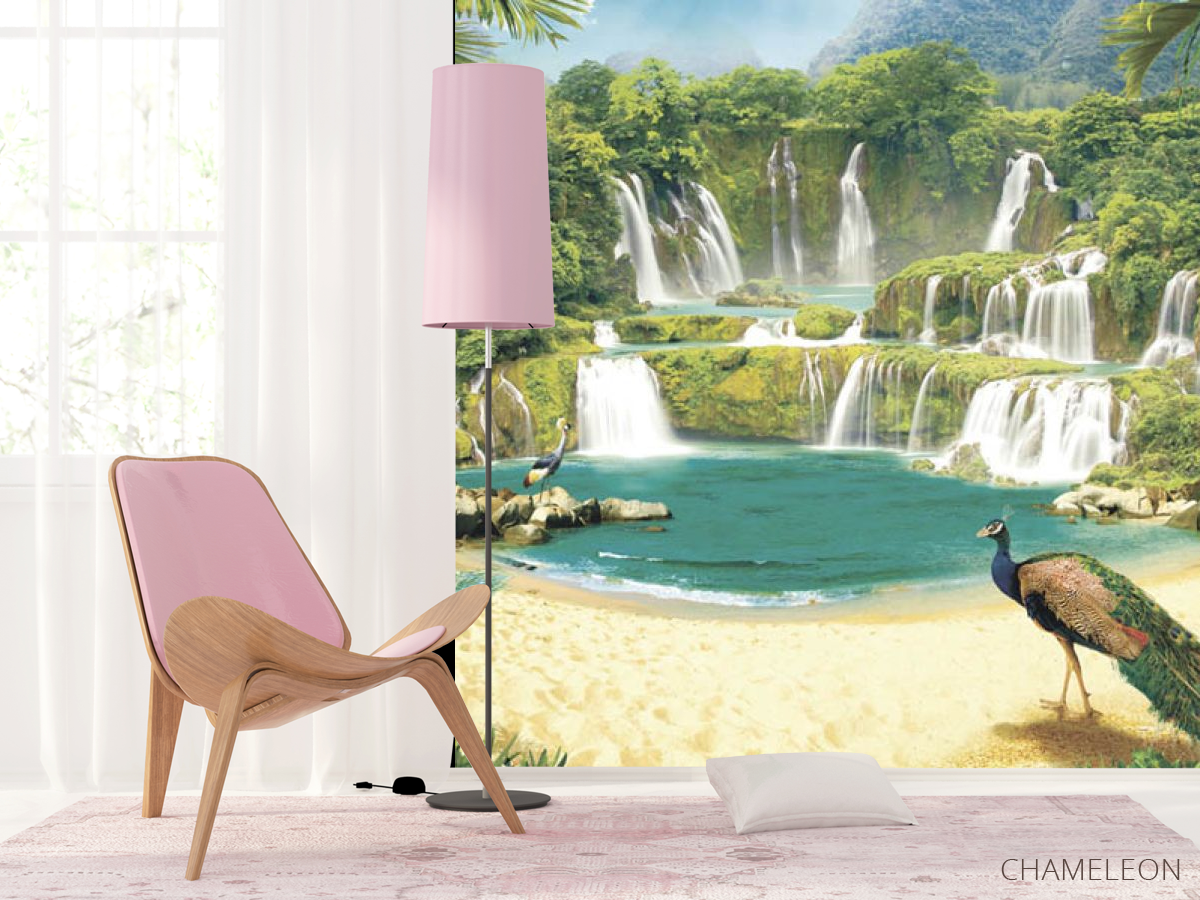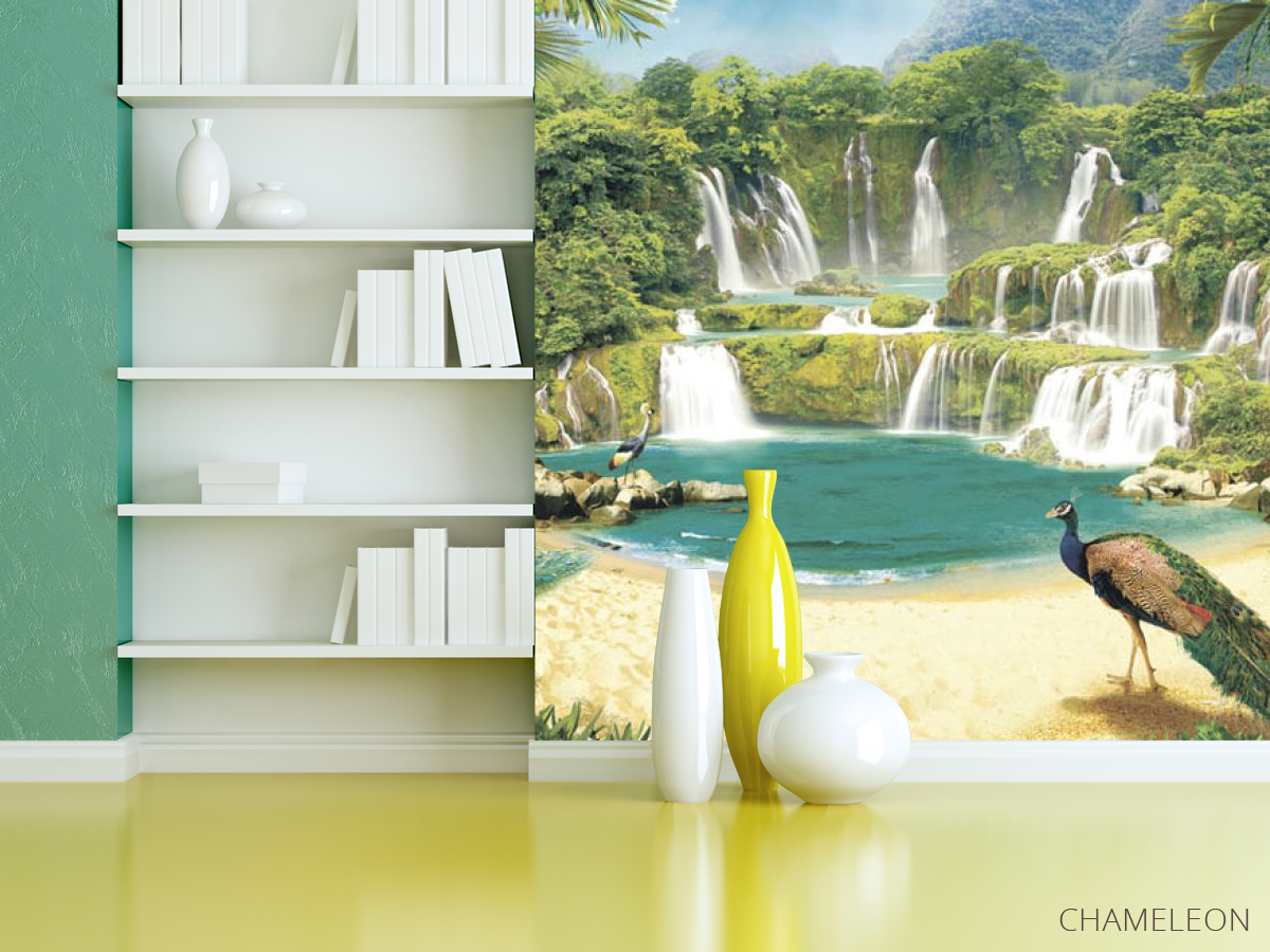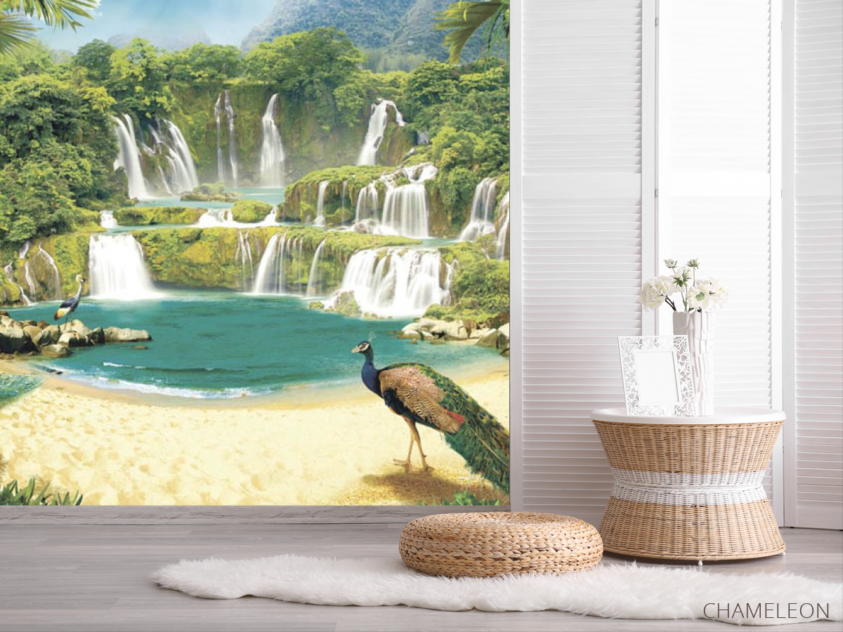 Фотошпалери Водоспад з павичами