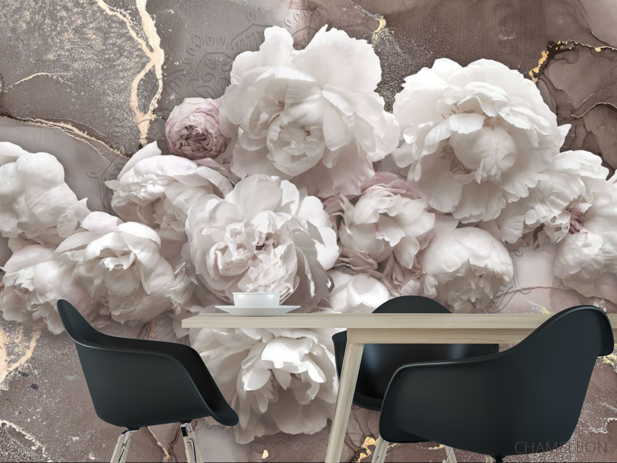 Фотошпалери Білі півонії з коричневим флюїдом