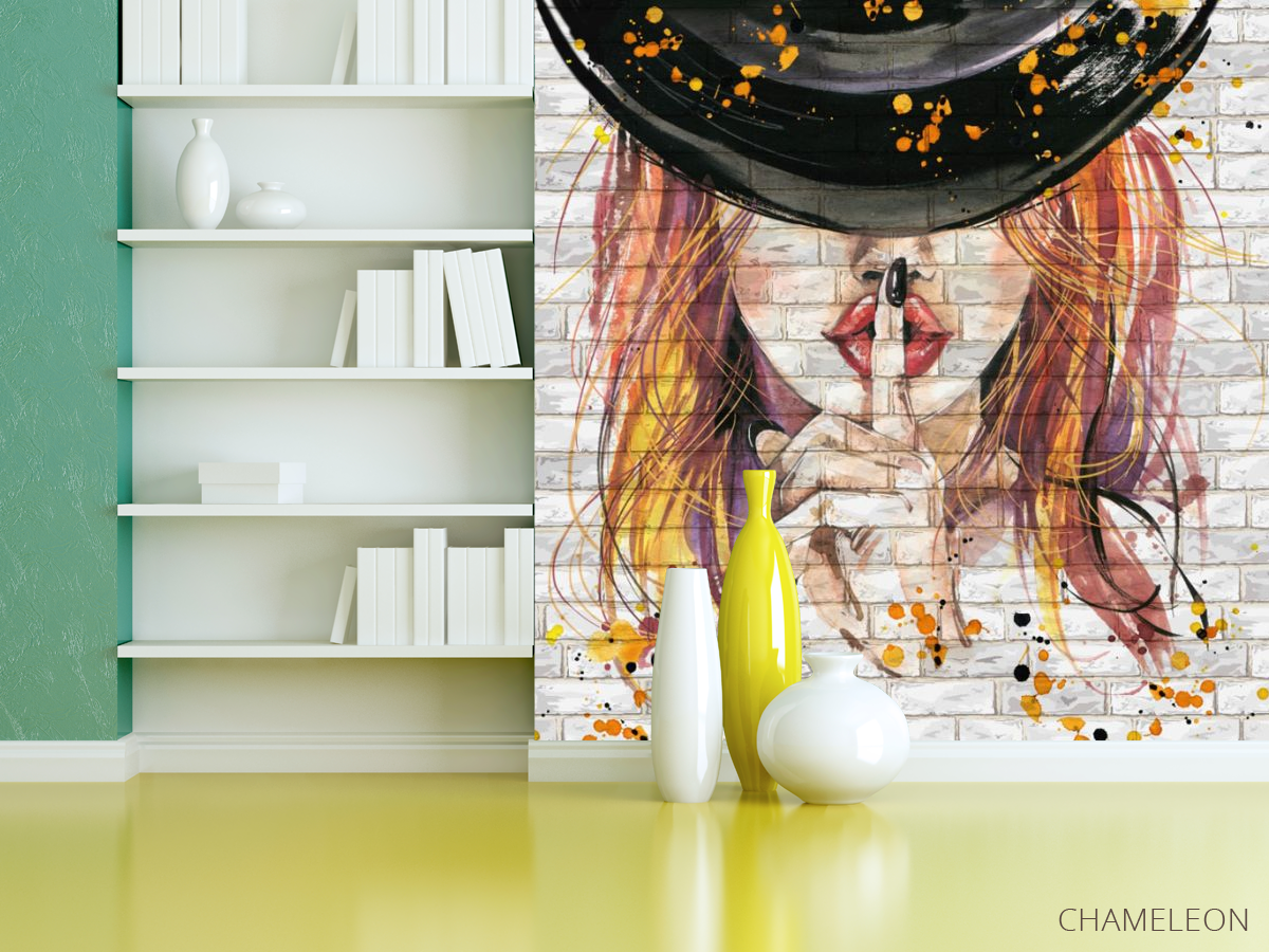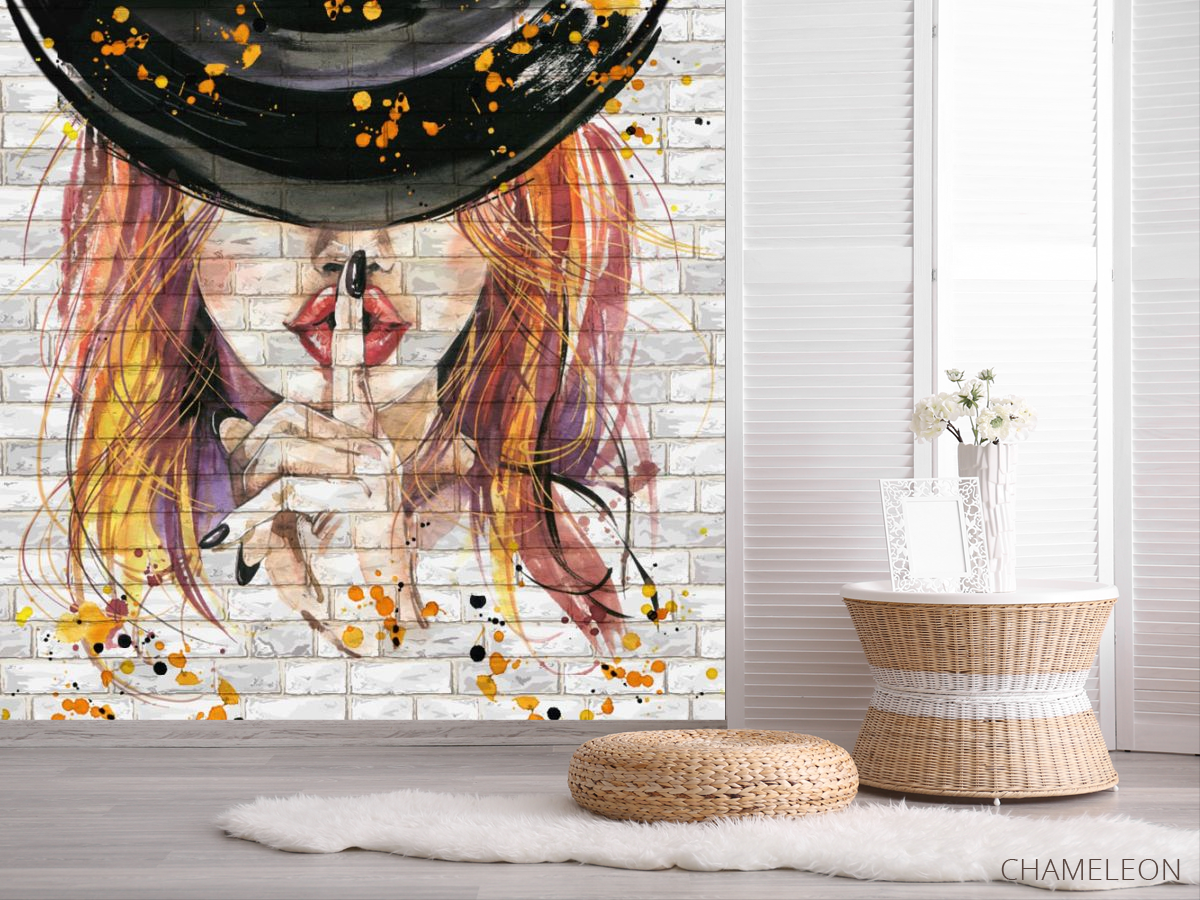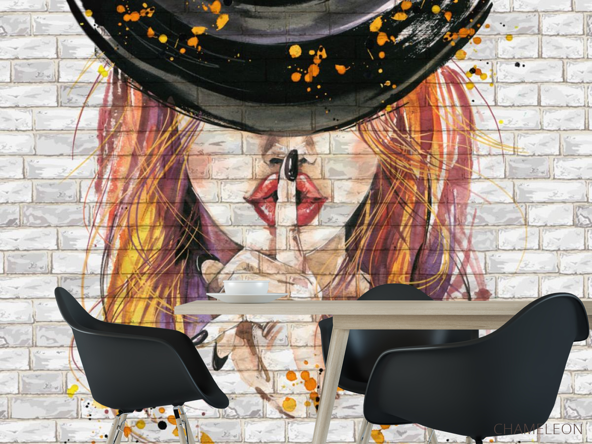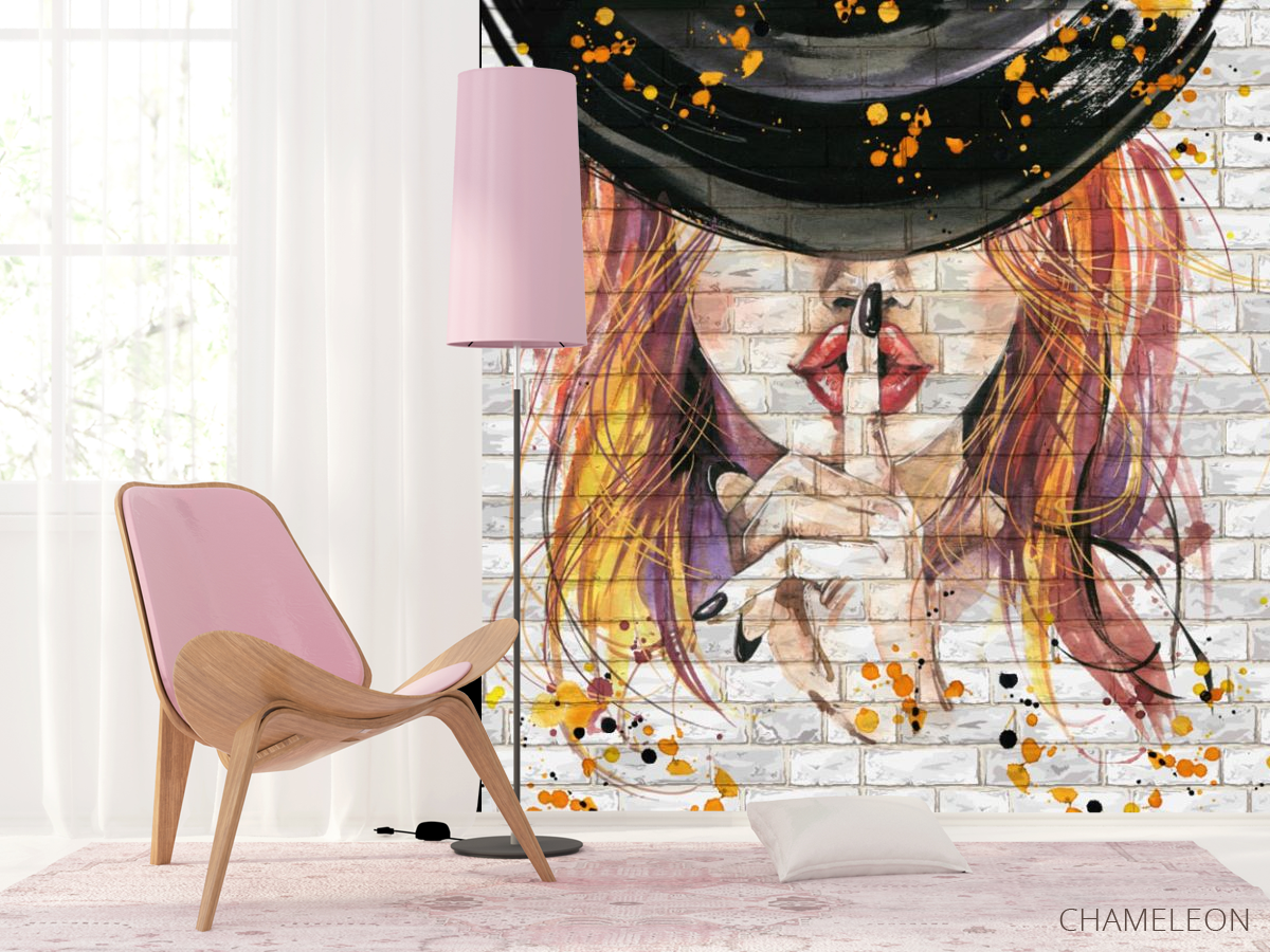 Фотошпалери дама в капелюсі, цегляна стіна, (арт. 31753) - купити в інтернет-магазині Chameleon