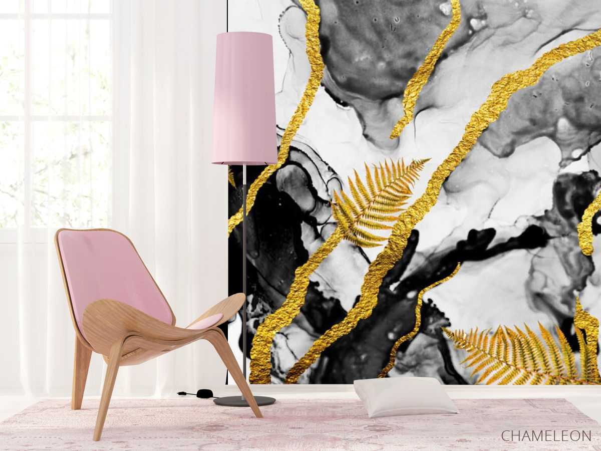 Фотошпалери чорні розводи флюїд арт з золотом.